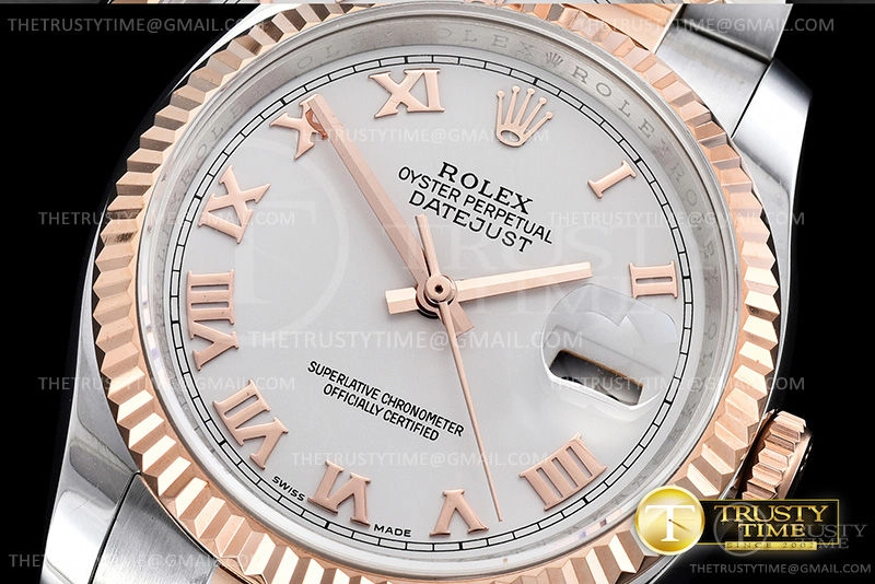 Часы Rolex из коллекции DateJust. Классические женские часы Rolex DateJust 36mm 116231-0092 премиального качества (Артикул магазина: RX-0451) оснащены надежным автоматическим механизмом с автоподзаводом (работает от амплитуды движения руки) калибра 3135, в котором реализованы следующие функции: часовая, минутная и секундная стрелки, а так же дата. Круглый корпус часов комбинированного сталь с розового золота цвета, имеющий размер 36 мм и высоту 12 мм превосходно дополнит образ и украсит запястье своего обладателя. Для изготовления часов Rolex DateJust 36mm 116231-0092 предлагаемых в нашем интернет-магазине, применяются нержавеющая сталь 316F высокого качества (Швейцарский стандарт), а так же сапфировое стекло высокой прочности, благодаря чему обеспечивается максимальная защита от сколов и механических повреждений. Отличительной чертой данной модели является белый циферблат, часовые индексы которого обеспечивают римские цифры. Завершает образ браслет из нержавеющей стали комбинированного сталь с розовым золотом цвета с фирменной раскладывающейся застежкой Rolex. Водонепроницаемость данной модели составляет 30М (WR30) – допускается минимальное воздействие с водой.