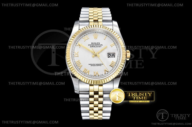 Часы Rolex из коллекции DateJust. Классические женские часы Rolex DateJust 36mm 116233-0149 премиального качества (Артикул магазина: RX-0443) оснащены надежным автоматическим механизмом с автоподзаводом (работает от амплитуды движения руки) калибра 3135, в котором реализованы следующие функции: часовая, минутная и секундная стрелки, а так же дата. Круглый корпус часов комбинированного сталь с желтого золота цвета, имеющий размер 36 мм и высоту 12 мм превосходно дополнит образ и украсит запястье своего обладателя. Для изготовления часов Rolex DateJust 36mm 116233-0149 предлагаемых в нашем интернет-магазине, применяются нержавеющая сталь 316F высокого качества (Швейцарский стандарт), а так же сапфировое стекло высокой прочности, благодаря чему обеспечивается максимальная защита от сколов и механических повреждений. Отличительной чертой данной модели является белый циферблат, часовые индексы которого обеспечивают римские цифры. Завершает образ браслет из нержавеющей стали комбинированного сталь с желтым золотом цвета с фирменной раскладывающейся застежкой Rolex. Водонепроницаемость данной модели составляет 30М (WR30) – допускается минимальное воздействие с водой.