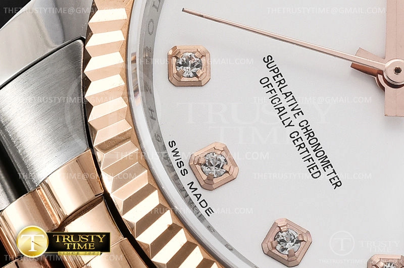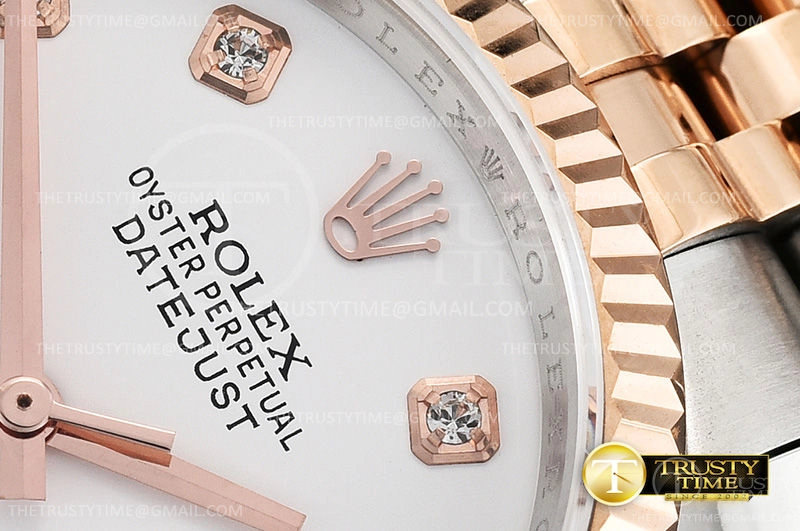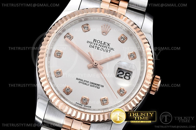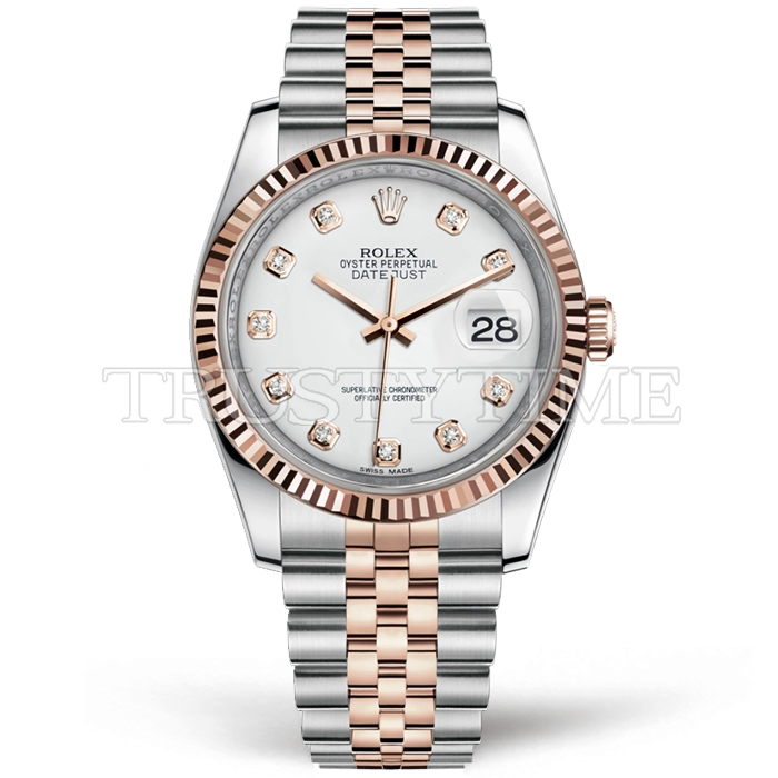 Часы Rolex из коллекции DateJust. Классические женские часы Rolex DateJust 36mm 116231-0060 премиального качества (Артикул магазина: RX-0437) оснащены надежным автоматическим механизмом с автоподзаводом (работает от амплитуды движения руки) калибра 3135, в котором реализованы следующие функции: часовая, минутная и секундная стрелки, а так же дата. Круглый корпус часов комбинированного сталь с розового золота цвета, имеющий размер 36 мм и высоту 12 мм превосходно дополнит образ и украсит запястье своего обладателя. Для изготовления часов Rolex DateJust 36mm 116231-0060 предлагаемых в нашем интернет-магазине, применяются нержавеющая сталь 316F высокого качества (Швейцарский стандарт), а так же сапфировое стекло высокой прочности, благодаря чему обеспечивается максимальная защита от сколов и механических повреждений. Отличительной чертой данной модели является белый циферблат, часовые индексы которого обеспечивают камни. Завершает образ браслет из нержавеющей стали комбинированного сталь с розовым золотом цвета с фирменной раскладывающейся застежкой Rolex. Водонепроницаемость данной модели составляет 30М (WR30) – допускается минимальное воздействие с водой.