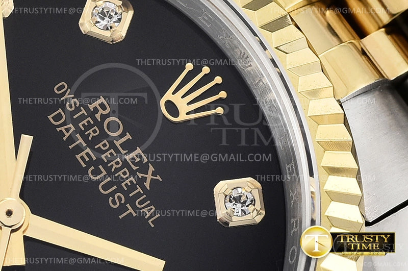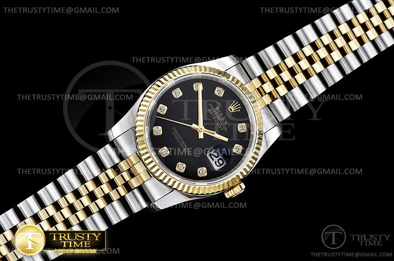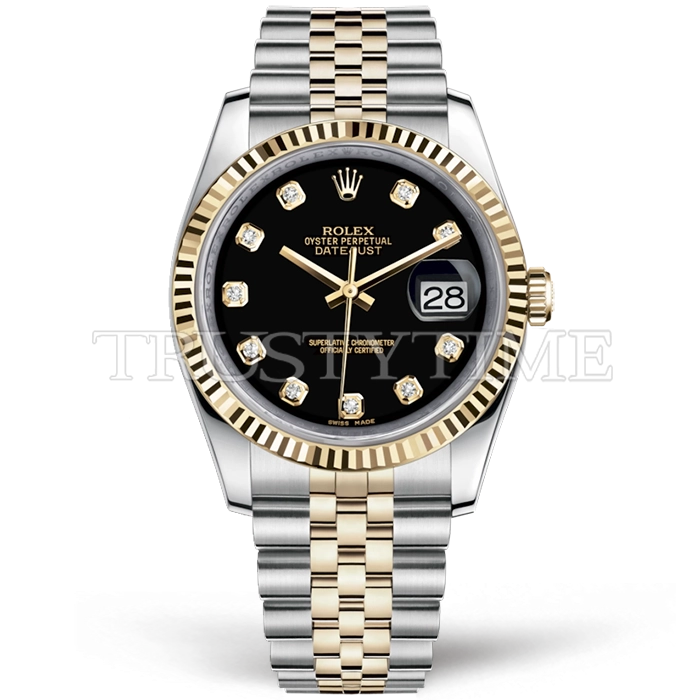 Часы Rolex из коллекции DateJust. Классические женские часы Rolex DateJust 36mm 116233-0158 премиального качества (Артикул магазина: RX-0440) оснащены надежным автоматическим механизмом с автоподзаводом (работает от амплитуды движения руки) калибра 3135, в котором реализованы следующие функции: часовая, минутная и секундная стрелки, а так же дата. Круглый корпус часов комбинированного сталь с желтого золота цвета, имеющий размер 36 мм и высоту 12 мм превосходно дополнит образ и украсит запястье своего обладателя. Для изготовления часов Rolex DateJust 36mm 116233-0158 предлагаемых в нашем интернет-магазине, применяются нержавеющая сталь 316F высокого качества (Швейцарский стандарт), а так же сапфировое стекло высокой прочности, благодаря чему обеспечивается максимальная защита от сколов и механических повреждений. Отличительной чертой данной модели является черный циферблат, часовые индексы которого обеспечивают камни. Завершает образ браслет из нержавеющей стали комбинированного сталь с желтым золотом цвета с фирменной раскладывающейся застежкой Rolex. Водонепроницаемость данной модели составляет 30М (WR30) – допускается минимальное воздействие с водой.
