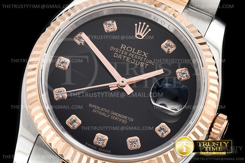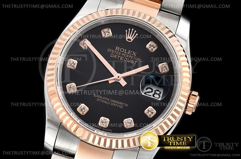 Часы Rolex из коллекции DateJust. Классические женские часы Rolex DateJust 36mm 116231-0071 премиального качества (Артикул магазина: RX-0430) оснащены надежным автоматическим механизмом с автоподзаводом (работает от амплитуды движения руки) калибра 3135, в котором реализованы следующие функции: часовая, минутная и секундная стрелки, а так же дата. Круглый корпус часов комбинированного сталь с розового золота цвета, имеющий размер 36 мм и высоту 12 мм превосходно дополнит образ и украсит запястье своего обладателя. Для изготовления часов Rolex DateJust 36mm 116231-0071 предлагаемых в нашем интернет-магазине, применяются нержавеющая сталь 316F высокого качества (Швейцарский стандарт), а так же сапфировое стекло высокой прочности, благодаря чему обеспечивается максимальная защита от сколов и механических повреждений. Отличительной чертой данной модели является черный циферблат, часовые индексы которого обеспечивают камни. Завершает образ браслет из нержавеющей стали комбинированного сталь с розовым золотом цвета с фирменной раскладывающейся застежкой Rolex. Водонепроницаемость данной модели составляет 30М (WR30) – допускается минимальное воздействие с водой.