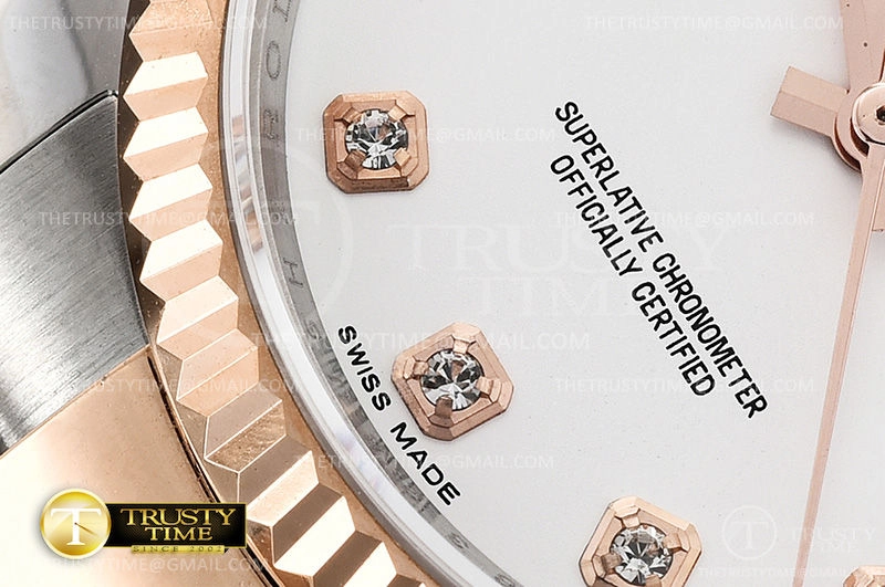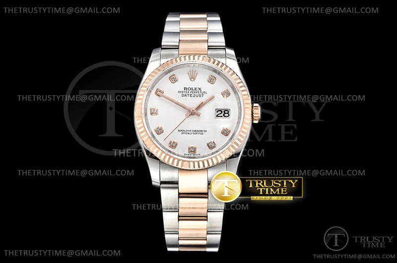 Часы Rolex из коллекции DateJust. Классические женские часы Rolex DateJust 36mm 116231-0063 премиального качества (Артикул магазина: RX-0431) оснащены надежным автоматическим механизмом с автоподзаводом (работает от амплитуды движения руки) калибра 3135, в котором реализованы следующие функции: часовая, минутная и секундная стрелки, а так же дата. Круглый корпус часов комбинированного сталь с розового золота цвета, имеющий размер 36 мм и высоту 12 мм превосходно дополнит образ и украсит запястье своего обладателя. Для изготовления часов Rolex DateJust 36mm 116231-0063 предлагаемых в нашем интернет-магазине, применяются нержавеющая сталь 316F высокого качества (Швейцарский стандарт), а так же сапфировое стекло высокой прочности, благодаря чему обеспечивается максимальная защита от сколов и механических повреждений. Отличительной чертой данной модели является белый циферблат, часовые индексы которого обеспечивают камни. Завершает образ браслет из нержавеющей стали комбинированного сталь с розовым золотом цвета с фирменной раскладывающейся застежкой Rolex. Водонепроницаемость данной модели составляет 30М (WR30) – допускается минимальное воздействие с водой.