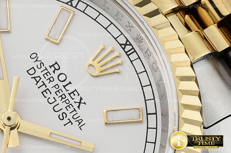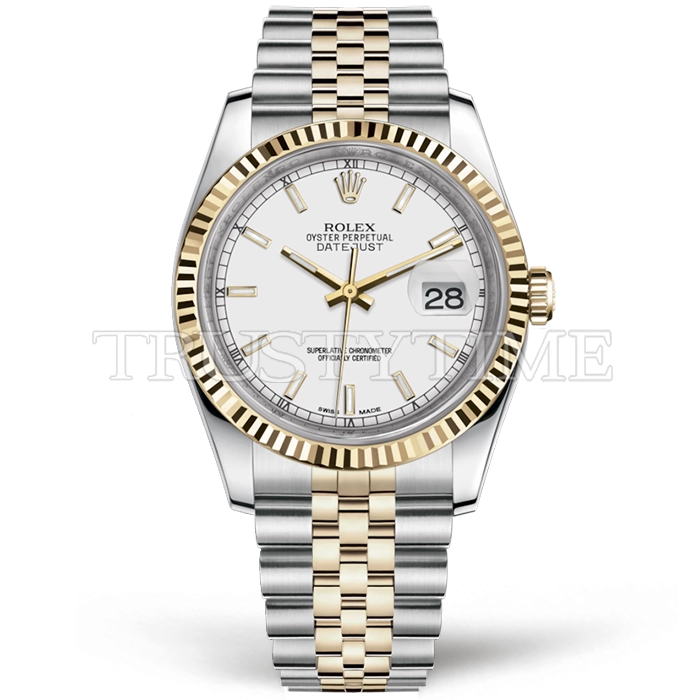 Часы Rolex из коллекции DateJust. Классические женские часы Rolex DateJust 36mm 116233-0200 премиального качества (Артикул магазина: RX-0421) оснащены надежным автоматическим механизмом с автоподзаводом (работает от амплитуды движения руки) калибра 3135, в котором реализованы следующие функции: часовая, минутная и секундная стрелки, а так же дата. Круглый корпус часов комбинированного сталь с желтого золота цвета, имеющий размер 36 мм и высоту 12 мм превосходно дополнит образ и украсит запястье своего обладателя. Для изготовления часов Rolex DateJust 36mm 116233-0200 предлагаемых в нашем интернет-магазине, применяются нержавеющая сталь 316F высокого качества (Швейцарский стандарт), а так же сапфировое стекло высокой прочности, благодаря чему обеспечивается максимальная защита от сколов и механических повреждений. Отличительной чертой данной модели является белый циферблат, часовые индексы которого обеспечивают часовые метки. Завершает образ браслет из нержавеющей стали комбинированного сталь с желтым золотом цвета с фирменной раскладывающейся застежкой Rolex. Водонепроницаемость данной модели составляет 30М (WR30) – допускается минимальное воздействие с водой.