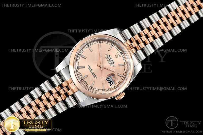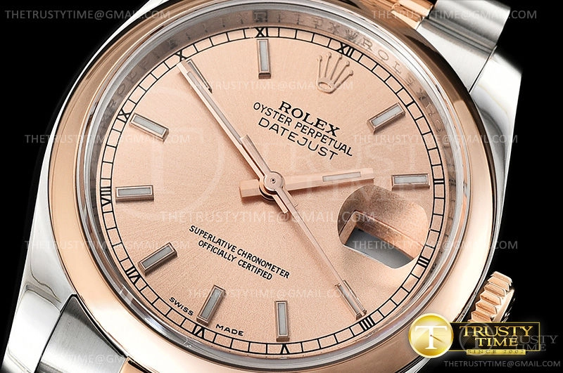 Часы Rolex из коллекции DateJust. Классические женские часы Rolex DateJust 36mm 116201-0097 премиального качества (Артикул магазина: RX-0413) оснащены надежным автоматическим механизмом с автоподзаводом (работает от амплитуды движения руки) калибра 3135, в котором реализованы следующие функции: часовая, минутная и секундная стрелки, а так же дата. Круглый корпус часов комбинированного сталь с розового золота цвета, имеющий размер 36 мм и высоту 12 мм превосходно дополнит образ и украсит запястье своего обладателя. Для изготовления часов Rolex DateJust 36mm 116201-0097 предлагаемых в нашем интернет-магазине, применяются нержавеющая сталь 904L высокого качества (Швейцарский стандарт), а так же сапфировое стекло высокой прочности, благодаря чему обеспечивается максимальная защита от сколов и механических повреждений. Отличительной чертой данной модели является золотой циферблат, часовые индексы которого обеспечивают часовые метки. Завершает образ браслет из нержавеющей стали комбинированного сталь с розовым золотом цвета с фирменной раскладывающейся застежкой Rolex. Водонепроницаемость данной модели составляет 30М (WR30) – допускается минимальное воздействие с водой.