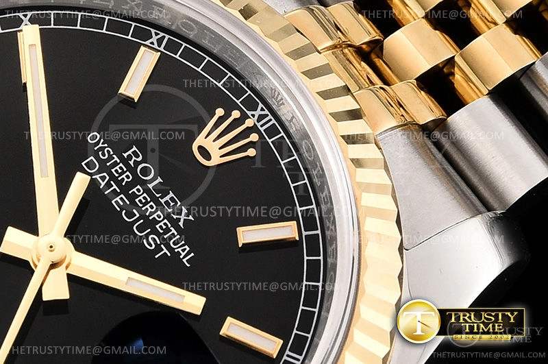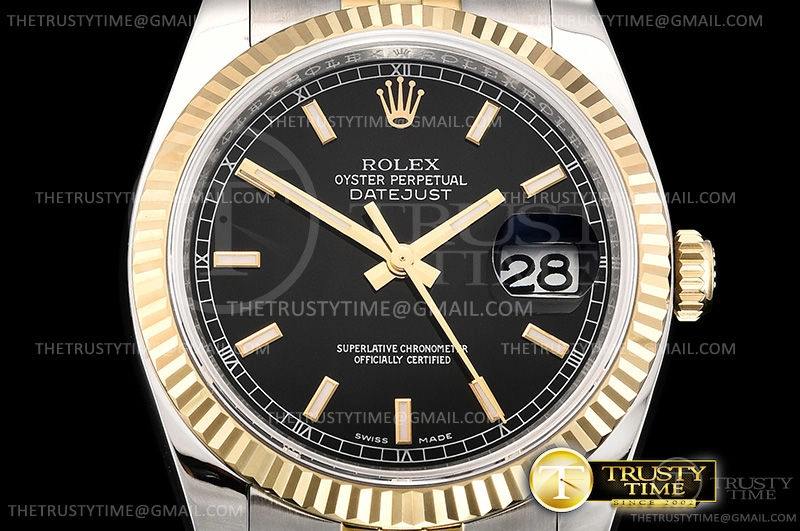 Часы Rolex из коллекции DateJust. Классические женские часы Rolex DateJust 36mm 116233-0199 премиального качества (Артикул магазина: RX-0372) оснащены надежным автоматическим механизмом с автоподзаводом (работает от амплитуды движения руки) калибра 3135, в котором реализованы следующие функции: часовая, минутная и секундная стрелки, а так же дата. Круглый корпус часов комбинированного сталь с желтого золота цвета, имеющий размер 36 мм и высоту 12 мм превосходно дополнит образ и украсит запястье своего обладателя. Для изготовления часов Rolex DateJust 36mm 116233-0199 предлагаемых в нашем интернет-магазине, применяются нержавеющая сталь 904L высокого качества (Швейцарский стандарт), а так же сапфировое стекло высокой прочности, благодаря чему обеспечивается максимальная защита от сколов и механических повреждений. Отличительной чертой данной модели является черный циферблат, часовые индексы которого обеспечивают часовые метки. Завершает образ браслет из нержавеющей стали комбинированного сталь с желтым золотом цвета с фирменной раскладывающейся застежкой Rolex. Водонепроницаемость данной модели составляет 30М (WR30) – допускается минимальное воздействие с водой.