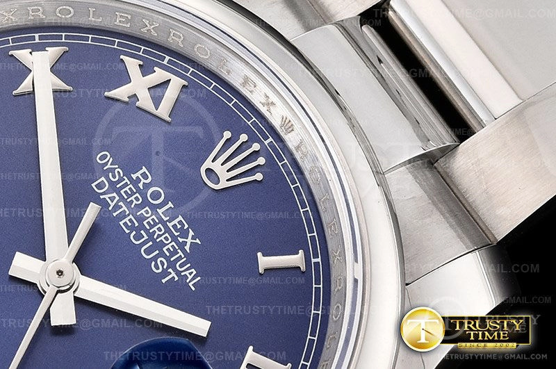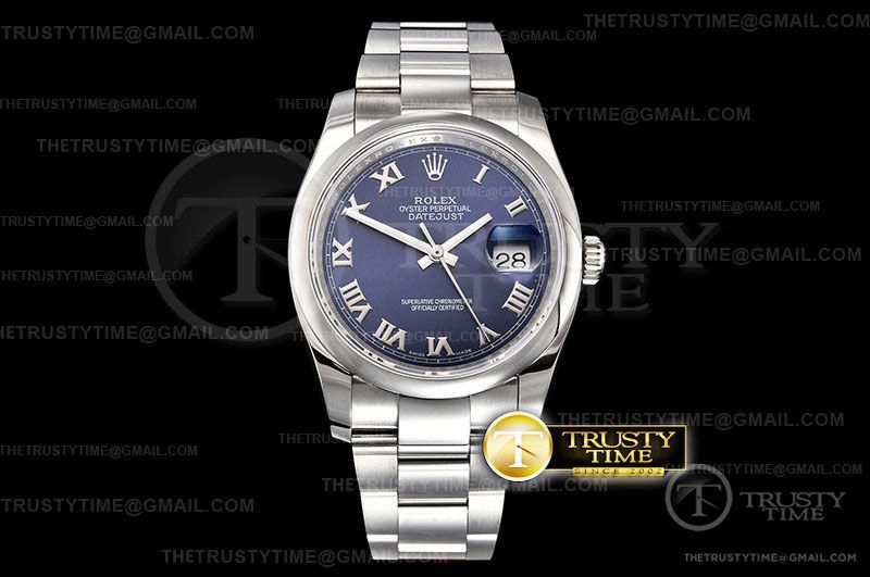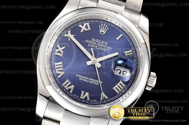 Часы Rolex из коллекции DateJust. Классические женские часы Rolex DateJust 36mm 116200-0060 премиального качества (Артикул магазина: RX-0287) оснащены надежным автоматическим механизмом с автоподзаводом (работает от амплитуды движения руки) калибра 3135, в котором реализованы следующие функции: часовая, минутная и секундная стрелки, а так же дата. Круглый корпус часов стального цвета, имеющий размер 36 мм и высоту 12 мм превосходно дополнит образ и украсит запястье своего обладателя. Для изготовления часов Rolex DateJust 36mm 116200-0060 предлагаемых в нашем интернет-магазине, применяются нержавеющая сталь 904L высокого качества (Швейцарский стандарт), а так же сапфировое стекло высокой прочности, благодаря чему обеспечивается максимальная защита от сколов и механических повреждений. Отличительной чертой данной модели является синий циферблат, часовые индексы которого обеспечивают римские цифры. Завершает образ браслет из нержавеющей стали стального цвета с фирменной раскладывающейся застежкой Rolex. Водонепроницаемость данной модели составляет 30М (WR30) – допускается минимальное воздействие с водой.