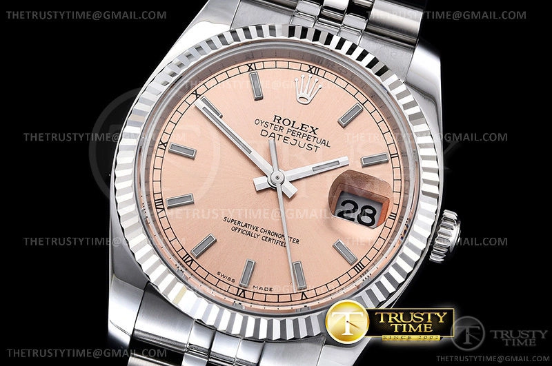 Часы Rolex из коллекции DateJust. Классические женские часы Rolex DateJust 36mm 116234-0108 премиального качества (Артикул магазина: RX-0265) оснащены надежным автоматическим механизмом с автоподзаводом (работает от амплитуды движения руки) калибра 3135, в котором реализованы следующие функции: часовая, минутная и секундная стрелки, а так же дата. Круглый корпус часов стального цвета, имеющий размер 36 мм и высоту 12 мм превосходно дополнит образ и украсит запястье своего обладателя. Для изготовления часов Rolex DateJust 36mm 116234-0108 предлагаемых в нашем интернет-магазине, применяются нержавеющая сталь 904L высокого качества (Швейцарский стандарт), а так же сапфировое стекло высокой прочности, благодаря чему обеспечивается максимальная защита от сколов и механических повреждений. Отличительной чертой данной модели является розовый циферблат, часовые индексы которого обеспечивают часовые метки. Завершает образ браслет из нержавеющей стали стального цвета с фирменной раскладывающейся застежкой Rolex. Водонепроницаемость данной модели составляет 30М (WR30) – допускается минимальное воздействие с водой.