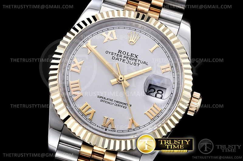 Часы Rolex из коллекции DateJust. Классические женские часы Rolex DateJust 36mm 126233-0029 премиального качества (Артикул магазина: RX-0212) оснащены надежным автоматическим механизмом с автоподзаводом (работает от амплитуды движения руки) калибра 3235, в котором реализованы следующие функции: часовая, минутная и секундная стрелки, а так же дата. Круглый корпус часов комбинированного сталь с желтого золота цвета, имеющий размер 36 мм и высоту 12 мм превосходно дополнит образ и украсит запястье своего обладателя. Для изготовления часов Rolex DateJust 36mm 126233-0029 предлагаемых в нашем интернет-магазине, применяются нержавеющая сталь 316F высокого качества (Швейцарский стандарт), а так же сапфировое стекло высокой прочности, благодаря чему обеспечивается максимальная защита от сколов и механических повреждений. Отличительной чертой данной модели является белый циферблат, часовые индексы которого обеспечивают римские цифры. Завершает образ браслет из нержавеющей стали комбинированного сталь с желтым золотом цвета с фирменной раскладывающейся застежкой Rolex. Водонепроницаемость данной модели составляет 30М (WR30) – допускается минимальное воздействие с водой.