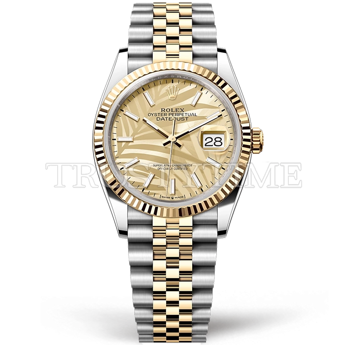 Часы Rolex из коллекции DateJust. Классические женские часы Rolex DateJust 36mm 126233-0037 премиального качества (Артикул магазина: RX-2089) оснащены надежным автоматическим механизмом с автоподзаводом (работает от амплитуды движения руки) калибра 3235, в котором реализованы следующие функции: часовая, минутная и секундная стрелки, а так же дата. Круглый корпус часов комбинированного сталь с желтого золота цвета, имеющий размер 36 мм и высоту 12 мм превосходно дополнит образ и украсит запястье своего обладателя. Для изготовления часов Rolex DateJust 36mm 126233-0037 предлагаемых в нашем интернет-магазине, применяются нержавеющая сталь 904L высокого качества (Швейцарский стандарт), а так же сапфировое стекло высокой прочности, благодаря чему обеспечивается максимальная защита от сколов и механических повреждений. Отличительной чертой данной модели является золотой циферблат, часовые индексы которого обеспечивают часовые метки. Завершает образ браслет из нержавеющей стали комбинированного сталь с желтым золотом цвета с фирменной раскладывающейся застежкой Rolex. Водонепроницаемость данной модели составляет 30М (WR30) – допускается минимальное воздействие с водой.