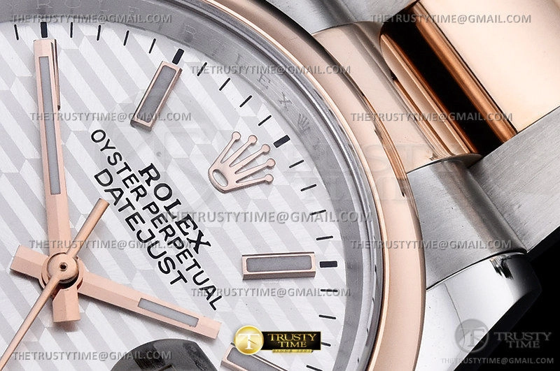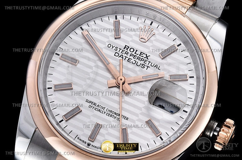 Часы Rolex из коллекции DateJust. Классические женские часы Rolex DateJust 36mm 126201-0034 премиального качества (Артикул магазина: RX-2120) оснащены надежным автоматическим механизмом с автоподзаводом (работает от амплитуды движения руки) калибра 3235, в котором реализованы следующие функции: часовая, минутная и секундная стрелки, а так же дата. Круглый корпус часов комбинированного сталь с розового золота цвета, имеющий размер 36 мм и высоту 12 мм превосходно дополнит образ и украсит запястье своего обладателя. Для изготовления часов Rolex DateJust 36mm 126201-0034 предлагаемых в нашем интернет-магазине, применяются нержавеющая сталь 316L высокого качества (Швейцарский стандарт), а так же сапфировое стекло высокой прочности, благодаря чему обеспечивается максимальная защита от сколов и механических повреждений. Отличительной чертой данной модели является серебристый циферблат, часовые индексы которого обеспечивают часовые метки. Завершает образ браслет из нержавеющей стали комбинированного сталь с розовым золотом цвета с фирменной раскладывающейся застежкой Rolex. Водонепроницаемость данной модели составляет 30М (WR30) – допускается минимальное воздействие с водой.