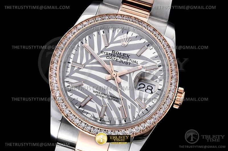 Часы Rolex из коллекции DateJust. Классические женские часы Rolex DateJust 36mm 126281RBR-0020 премиального качества (Артикул магазина: RX-2132) оснащены надежным автоматическим механизмом с автоподзаводом (работает от амплитуды движения руки) калибра 3235, в котором реализованы следующие функции: часовая, минутная и секундная стрелки, а так же дата. Круглый корпус часов комбинированного сталь с розового золота цвета, имеющий размер 36 мм и высоту 12 мм превосходно дополнит образ и украсит запястье своего обладателя. Для изготовления часов Rolex DateJust 36mm 126281RBR-0020 предлагаемых в нашем интернет-магазине, применяются нержавеющая сталь 316L высокого качества (Швейцарский стандарт), а так же сапфировое стекло высокой прочности, благодаря чему обеспечивается максимальная защита от сколов и механических повреждений. Отличительной чертой данной модели является серебристый циферблат, часовые индексы которого обеспечивают часовые метки. Завершает образ браслет из нержавеющей стали комбинированного сталь с розовым золотом цвета с фирменной раскладывающейся застежкой Rolex. Водонепроницаемость данной модели составляет 30М (WR30) – допускается минимальное воздействие с водой.