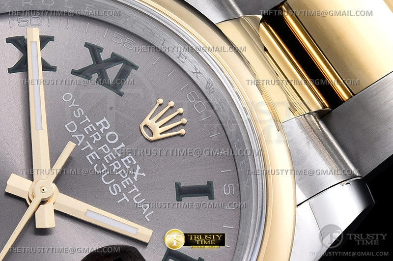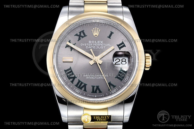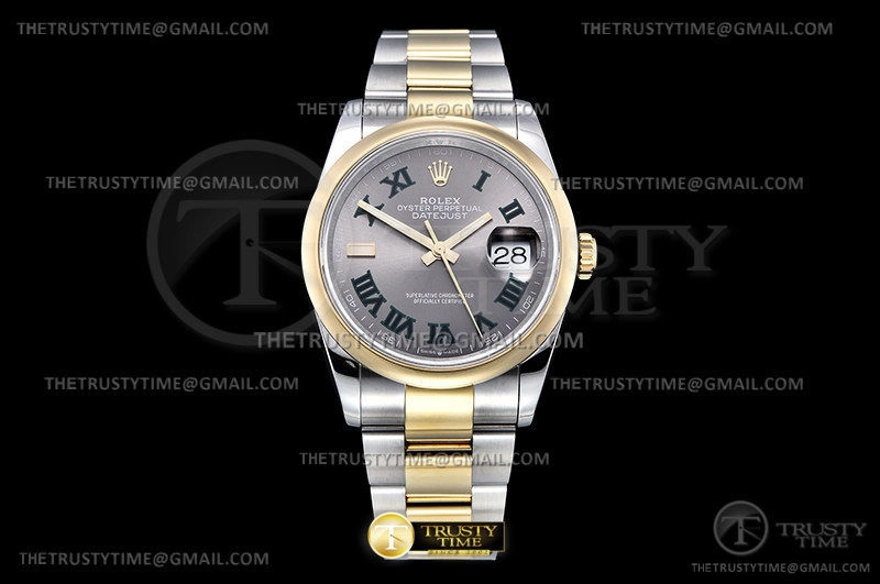 Часы Rolex из коллекции DateJust. Классические женские часы Rolex DateJust 36mm 126203-0036 премиального качества (Артикул магазина: RX-2138) оснащены надежным автоматическим механизмом с автоподзаводом (работает от амплитуды движения руки) калибра 3235, в котором реализованы следующие функции: часовая, минутная и секундная стрелки, а так же дата. Круглый корпус часов комбинированного сталь с желтого золота цвета, имеющий размер 36 мм и высоту 12 мм превосходно дополнит образ и украсит запястье своего обладателя. Для изготовления часов Rolex DateJust 36mm 126203-0036 предлагаемых в нашем интернет-магазине, применяются нержавеющая сталь 316L высокого качества (Швейцарский стандарт), а так же сапфировое стекло высокой прочности, благодаря чему обеспечивается максимальная защита от сколов и механических повреждений. Отличительной чертой данной модели является серый циферблат, часовые индексы которого обеспечивают римские цифры. Завершает образ браслет из нержавеющей стали комбинированного сталь с желтым золотом цвета с фирменной раскладывающейся застежкой Rolex. Водонепроницаемость данной модели составляет 30М (WR30) – допускается минимальное воздействие с водой.