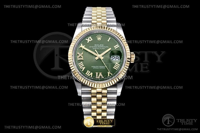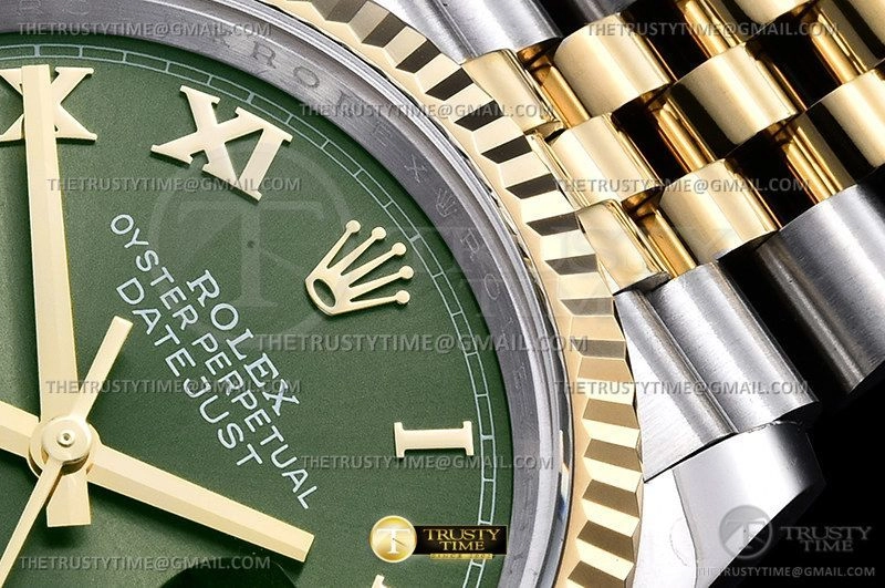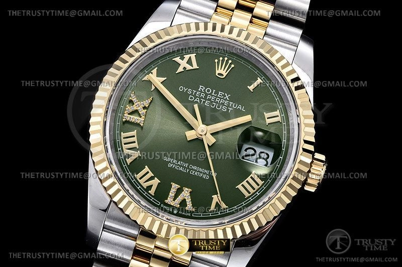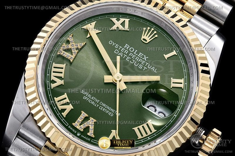 Часы Rolex из коллекции DateJust. Классические женские часы Rolex DateJust 36mm 126233-0025 премиального качества (Артикул магазина: RX-2271) оснащены надежным автоматическим механизмом с автоподзаводом (работает от амплитуды движения руки) калибра 3235, в котором реализованы следующие функции: часовая, минутная и секундная стрелки, а так же дата. Круглый корпус часов комбинированного сталь с желтого золота цвета, имеющий размер 36 мм и высоту 12 мм превосходно дополнит образ и украсит запястье своего обладателя. Для изготовления часов Rolex DateJust 36mm 126233-0025 предлагаемых в нашем интернет-магазине, применяются нержавеющая сталь 904L высокого качества (Швейцарский стандарт), а так же сапфировое стекло высокой прочности, благодаря чему обеспечивается максимальная защита от сколов и механических повреждений. Отличительной чертой данной модели является зеленый циферблат, часовые индексы которого обеспечивают римские цифры. Завершает образ браслет из нержавеющей стали комбинированного сталь с желтым золотом цвета с фирменной раскладывающейся застежкой Rolex. Водонепроницаемость данной модели составляет 30М (WR30) – допускается минимальное воздействие с водой.