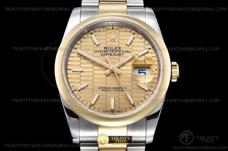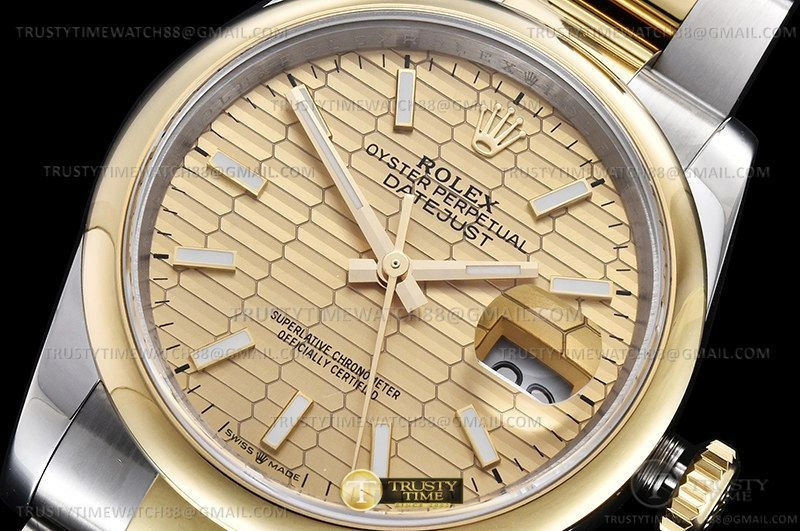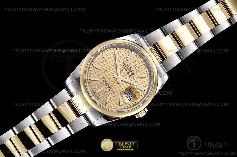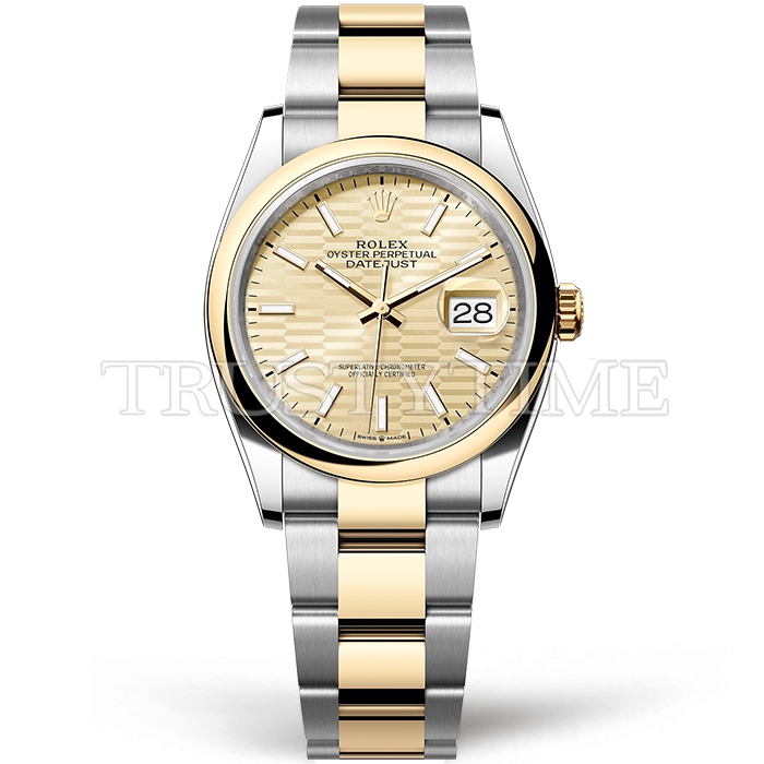 Часы Rolex из коллекции DateJust. Классические женские часы Rolex DateJust 36mm 126203-0040 премиального качества (Артикул магазина: RX-2331) оснащены надежным автоматическим механизмом с автоподзаводом (работает от амплитуды движения руки) калибра 3235, в котором реализованы следующие функции: часовая, минутная и секундная стрелки, а так же дата. Круглый корпус часов комбинированного сталь с желтого золота цвета, имеющий размер 36 мм и высоту 12 мм превосходно дополнит образ и украсит запястье своего обладателя. Для изготовления часов Rolex DateJust 36mm 126203-0040 предлагаемых в нашем интернет-магазине, применяются нержавеющая сталь 904L высокого качества (Швейцарский стандарт), а так же сапфировое стекло высокой прочности, благодаря чему обеспечивается максимальная защита от сколов и механических повреждений. Отличительной чертой данной модели является золотой циферблат, часовые индексы которого обеспечивают часовые метки. Завершает образ браслет из нержавеющей стали комбинированного сталь с желтым золотом цвета с фирменной раскладывающейся застежкой Rolex. Водонепроницаемость данной модели составляет 30М (WR30) – допускается минимальное воздействие с водой.