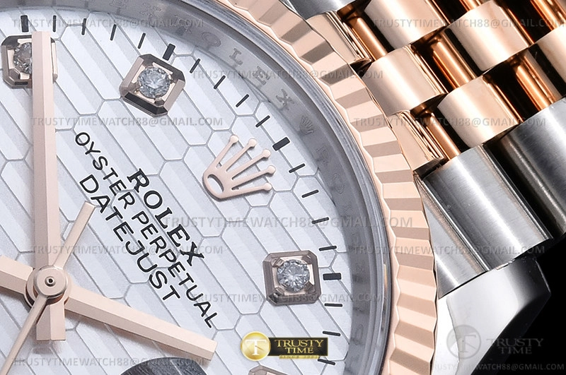 Часы Rolex из коллекции DateJust. Классические женские часы Rolex DateJust 36mm 126231-0039 премиального качества (Артикул магазина: RX-2531) оснащены надежным автоматическим механизмом с автоподзаводом (работает от амплитуды движения руки) калибра 3235, в котором реализованы следующие функции: часовая, минутная и секундная стрелки, а так же дата. Круглый корпус часов комбинированного сталь с розового золота цвета, имеющий размер 36 мм и высоту 12 мм превосходно дополнит образ и украсит запястье своего обладателя. Для изготовления часов Rolex DateJust 36mm 126231-0039 предлагаемых в нашем интернет-магазине, применяются нержавеющая сталь 316F высокого качества (Швейцарский стандарт), а так же сапфировое стекло высокой прочности, благодаря чему обеспечивается максимальная защита от сколов и механических повреждений. Отличительной чертой данной модели является серебристый циферблат, часовые индексы которого обеспечивают камни. Завершает образ браслет из нержавеющей стали комбинированного сталь с розовым золотом цвета с фирменной раскладывающейся застежкой Rolex. Водонепроницаемость данной модели составляет 30М (WR30) – допускается минимальное воздействие с водой.