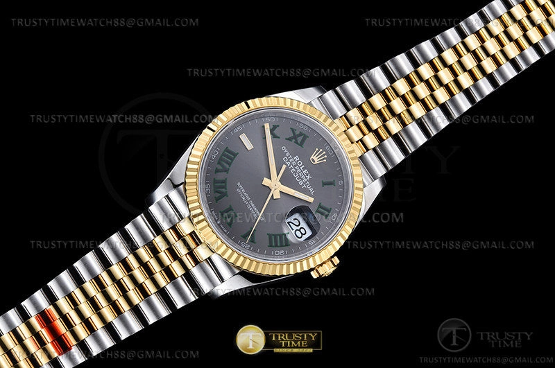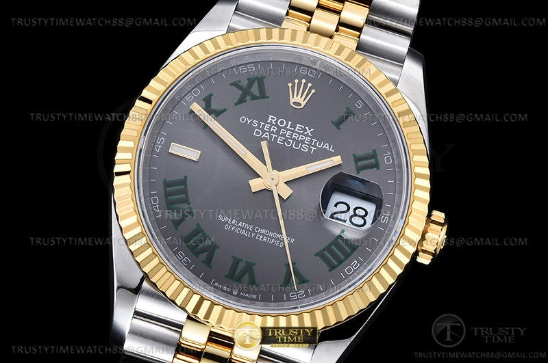 Часы Rolex из коллекции DateJust. Классические женские часы Rolex DateJust 36mm 126233-0035 премиального качества (Артикул магазина: RX-2545) оснащены надежным автоматическим механизмом с автоподзаводом (работает от амплитуды движения руки) калибра 3235, в котором реализованы следующие функции: часовая, минутная и секундная стрелки, а так же дата. Круглый корпус часов комбинированного сталь с желтого золота цвета, имеющий размер 36 мм и высоту 12 мм превосходно дополнит образ и украсит запястье своего обладателя. Для изготовления часов Rolex DateJust 36mm 126233-0035 предлагаемых в нашем интернет-магазине, применяются нержавеющая сталь 316L высокого качества (Швейцарский стандарт), а так же сапфировое стекло высокой прочности, благодаря чему обеспечивается максимальная защита от сколов и механических повреждений. Отличительной чертой данной модели является серый циферблат, часовые индексы которого обеспечивают римские цифры. Завершает образ браслет из нержавеющей стали комбинированного сталь с желтым золотом цвета с фирменной раскладывающейся застежкой Rolex. Водонепроницаемость данной модели составляет 30М (WR30) – допускается минимальное воздействие с водой.