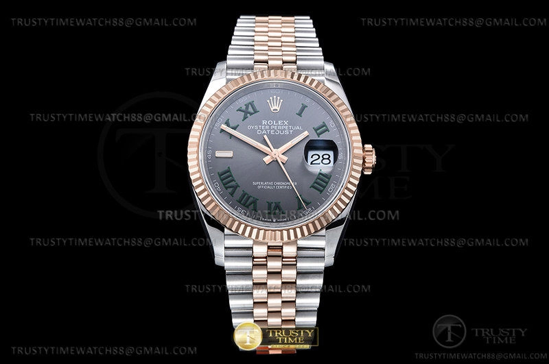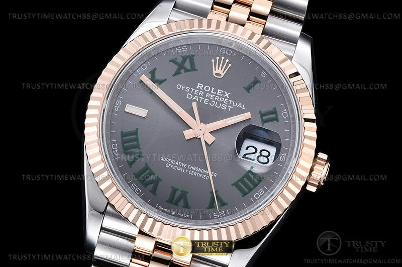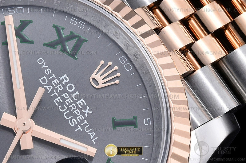 Часы Rolex из коллекции DateJust. Классические женские часы Rolex DateJust 36mm 126231-0029 премиального качества (Артикул магазина: RX-2101) оснащены надежным автоматическим механизмом с автоподзаводом (работает от амплитуды движения руки) калибра 3235, в котором реализованы следующие функции: часовая, минутная и секундная стрелки, а так же дата. Круглый корпус часов комбинированного сталь с розового золота цвета, имеющий размер 36 мм и высоту 12 мм превосходно дополнит образ и украсит запястье своего обладателя. Для изготовления часов Rolex DateJust 36mm 126231-0029 предлагаемых в нашем интернет-магазине, применяются нержавеющая сталь 904L высокого качества (Швейцарский стандарт), а так же сапфировое стекло высокой прочности, благодаря чему обеспечивается максимальная защита от сколов и механических повреждений. Отличительной чертой данной модели является серый циферблат, часовые индексы которого обеспечивают римские цифры. Завершает образ браслет из нержавеющей стали комбинированного сталь с розовым золотом цвета с фирменной раскладывающейся застежкой Rolex. Водонепроницаемость данной модели составляет 30М (WR30) – допускается минимальное воздействие с водой.