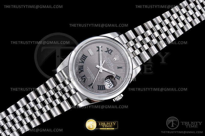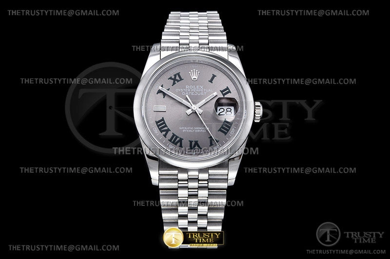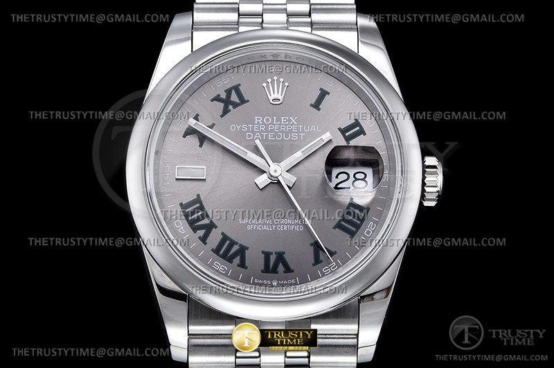 Часы Rolex из коллекции DateJust. Классические женские часы Rolex DateJust 36mm 126200-0017 премиального качества (Артикул магазина: RX-2081) оснащены надежным автоматическим механизмом с автоподзаводом (работает от амплитуды движения руки) калибра 3235, в котором реализованы следующие функции: часовая, минутная и секундная стрелки, а так же дата. Круглый корпус часов стального цвета, имеющий размер 36 мм и высоту 12 мм превосходно дополнит образ и украсит запястье своего обладателя. Для изготовления часов Rolex DateJust 36mm 126200-0017 предлагаемых в нашем интернет-магазине, применяются нержавеющая сталь 904L высокого качества (Швейцарский стандарт), а так же сапфировое стекло высокой прочности, благодаря чему обеспечивается максимальная защита от сколов и механических повреждений. Отличительной чертой данной модели является серый циферблат, часовые индексы которого обеспечивают римские цифры. Завершает образ браслет из нержавеющей стали стального цвета с фирменной раскладывающейся застежкой Rolex. Водонепроницаемость данной модели составляет 30М (WR30) – допускается минимальное воздействие с водой.