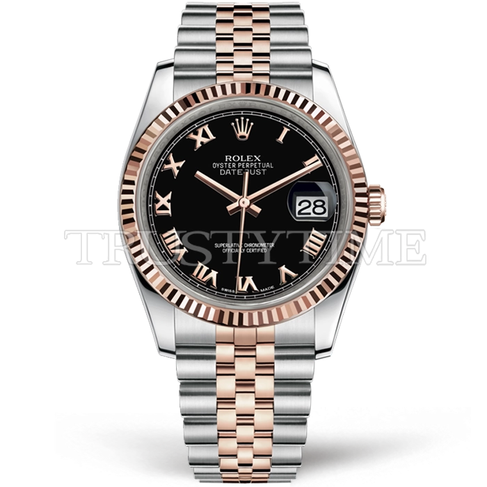 Часы Rolex из коллекции DateJust. Классические женские часы Rolex DateJust 36mm 116231-0085 премиального качества (Артикул магазина: RX-2456) оснащены надежным автоматическим механизмом с автоподзаводом (работает от амплитуды движения руки) калибра 3235, в котором реализованы следующие функции: часовая, минутная и секундная стрелки, а так же дата. Круглый корпус часов комбинированного сталь с розового золота цвета, имеющий размер 36 мм и высоту 12 мм превосходно дополнит образ и украсит запястье своего обладателя. Для изготовления часов Rolex DateJust 36mm 116231-0085 предлагаемых в нашем интернет-магазине, применяются нержавеющая сталь 904L высокого качества (Швейцарский стандарт), а так же сапфировое стекло высокой прочности, благодаря чему обеспечивается максимальная защита от сколов и механических повреждений. Отличительной чертой данной модели является черный циферблат, часовые индексы которого обеспечивают римские цифры. Завершает образ браслет из нержавеющей стали комбинированного сталь с розовым золотом цвета с фирменной раскладывающейся застежкой Rolex. Водонепроницаемость данной модели составляет 30М (WR30) – допускается минимальное воздействие с водой.