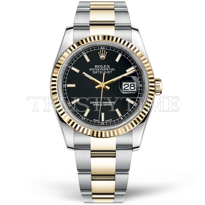 Часы Rolex из коллекции DateJust. Классические женские часы Rolex DateJust 36mm 116233-0173 премиального качества (Артикул магазина: RX-2461) оснащены надежным автоматическим механизмом с автоподзаводом (работает от амплитуды движения руки) калибра 3135, в котором реализованы следующие функции: часовая, минутная и секундная стрелки, а так же дата. Круглый корпус часов комбинированного сталь с желтого золота цвета, имеющий размер 36 мм и высоту 12 мм превосходно дополнит образ и украсит запястье своего обладателя. Для изготовления часов Rolex DateJust 36mm 116233-0173 предлагаемых в нашем интернет-магазине, применяются нержавеющая сталь 904L высокого качества (Швейцарский стандарт), а так же сапфировое стекло высокой прочности, благодаря чему обеспечивается максимальная защита от сколов и механических повреждений. Отличительной чертой данной модели является черный циферблат, часовые индексы которого обеспечивают часовые метки. Завершает образ браслет из нержавеющей стали комбинированного сталь с желтым золотом цвета с фирменной раскладывающейся застежкой Rolex. Водонепроницаемость данной модели составляет 30М (WR30) – допускается минимальное воздействие с водой.