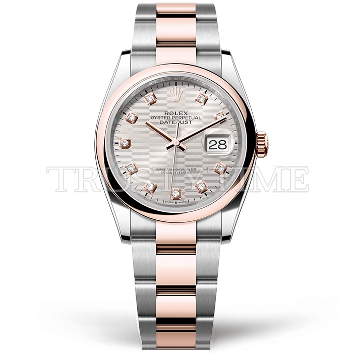 Часы Rolex из коллекции DateJust. Классические женские часы Rolex DateJust 36mm 126201-0040 премиального качества (Артикул магазина: RX-2496) оснащены надежным автоматическим механизмом с автоподзаводом (работает от амплитуды движения руки) калибра 3235, в котором реализованы следующие функции: часовая, минутная и секундная стрелки, а так же дата. Круглый корпус часов комбинированного сталь с розового золота цвета, имеющий размер 36 мм и высоту 12 мм превосходно дополнит образ и украсит запястье своего обладателя. Для изготовления часов Rolex DateJust 36mm 126201-0040 предлагаемых в нашем интернет-магазине, применяются нержавеющая сталь 316F высокого качества (Швейцарский стандарт), а так же сапфировое стекло высокой прочности, благодаря чему обеспечивается максимальная защита от сколов и механических повреждений. Отличительной чертой данной модели является серебристый циферблат, часовые индексы которого обеспечивают камни. Завершает образ браслет из нержавеющей стали комбинированного сталь с розовым золотом цвета с фирменной раскладывающейся застежкой Rolex. Водонепроницаемость данной модели составляет 30М (WR30) – допускается минимальное воздействие с водой.