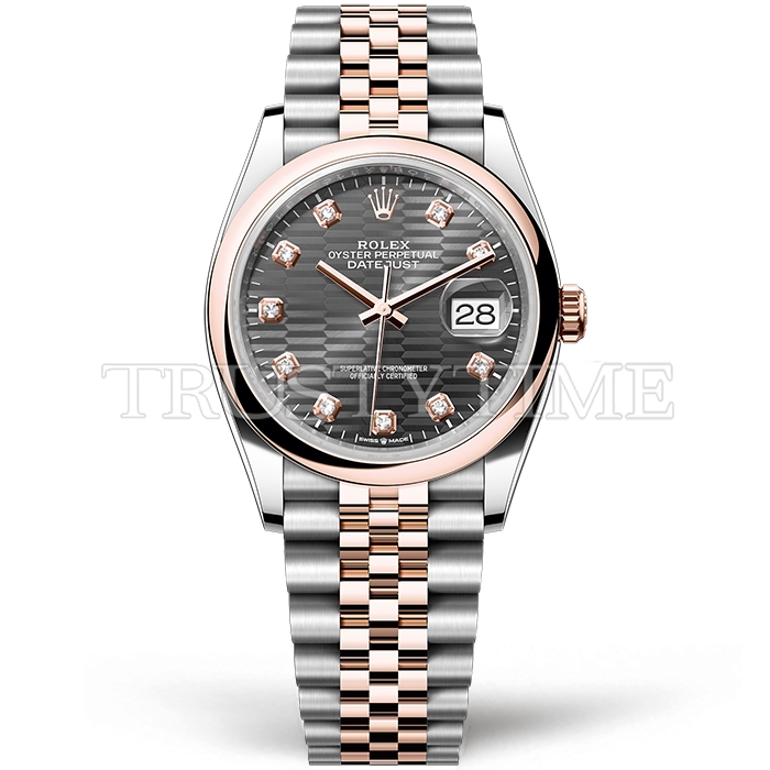 Часы Rolex из коллекции DateJust. Классические женские часы Rolex DateJust 36mm 126201-0041 премиального качества (Артикул магазина: RX-2497) оснащены надежным автоматическим механизмом с автоподзаводом (работает от амплитуды движения руки) калибра 3235, в котором реализованы следующие функции: часовая, минутная и секундная стрелки, а так же дата. Круглый корпус часов комбинированного сталь с розового золота цвета, имеющий размер 36 мм и высоту 12 мм превосходно дополнит образ и украсит запястье своего обладателя. Для изготовления часов Rolex DateJust 36mm 126201-0041 предлагаемых в нашем интернет-магазине, применяются нержавеющая сталь 316F высокого качества (Швейцарский стандарт), а так же сапфировое стекло высокой прочности, благодаря чему обеспечивается максимальная защита от сколов и механических повреждений. Отличительной чертой данной модели является серый циферблат, часовые индексы которого обеспечивают камни. Завершает образ браслет из нержавеющей стали комбинированного сталь с розовым золотом цвета с фирменной раскладывающейся застежкой Rolex. Водонепроницаемость данной модели составляет 30М (WR30) – допускается минимальное воздействие с водой.