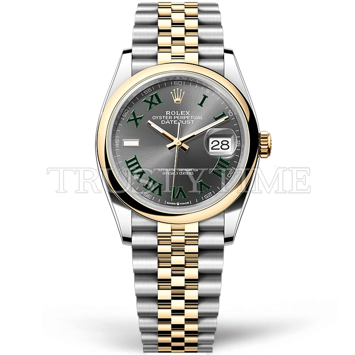 Часы Rolex из коллекции DateJust. Классические женские часы Rolex DateJust 36mm 126203-0035 премиального качества (Артикул магазина: RX-2515) оснащены надежным автоматическим механизмом с автоподзаводом (работает от амплитуды движения руки) калибра 3235, в котором реализованы следующие функции: часовая, минутная и секундная стрелки, а так же дата. Круглый корпус часов комбинированного сталь с желтого золота цвета, имеющий размер 36 мм и высоту 12 мм превосходно дополнит образ и украсит запястье своего обладателя. Для изготовления часов Rolex DateJust 36mm 126203-0035 предлагаемых в нашем интернет-магазине, применяются нержавеющая сталь 316L высокого качества (Швейцарский стандарт), а так же сапфировое стекло высокой прочности, благодаря чему обеспечивается максимальная защита от сколов и механических повреждений. Отличительной чертой данной модели является серый циферблат, часовые индексы которого обеспечивают римские цифры. Завершает образ браслет из нержавеющей стали комбинированного сталь с желтым золотом цвета с фирменной раскладывающейся застежкой Rolex. Водонепроницаемость данной модели составляет 30М (WR30) – допускается минимальное воздействие с водой.