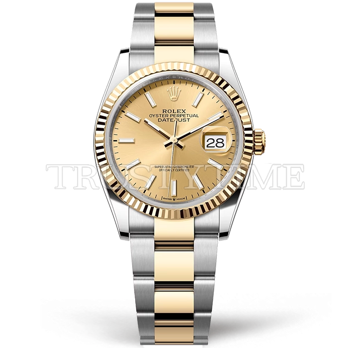 Часы Rolex из коллекции DateJust. Классические женские часы Rolex DateJust 36mm 126233-0016 премиального качества (Артикул магазина: RX-2536) оснащены надежным автоматическим механизмом с автоподзаводом (работает от амплитуды движения руки) калибра 3135, в котором реализованы следующие функции: часовая, минутная и секундная стрелки, а так же дата. Круглый корпус часов комбинированного сталь с желтого золота цвета, имеющий размер 36 мм и высоту 12 мм превосходно дополнит образ и украсит запястье своего обладателя. Для изготовления часов Rolex DateJust 36mm 126233-0016 предлагаемых в нашем интернет-магазине, применяются нержавеющая сталь 904L высокого качества (Швейцарский стандарт), а так же сапфировое стекло высокой прочности, благодаря чему обеспечивается максимальная защита от сколов и механических повреждений. Отличительной чертой данной модели является золотой циферблат, часовые индексы которого обеспечивают часовые метки. Завершает образ браслет из нержавеющей стали комбинированного сталь с желтым золотом цвета с фирменной раскладывающейся застежкой Rolex. Водонепроницаемость данной модели составляет 30М (WR30) – допускается минимальное воздействие с водой.