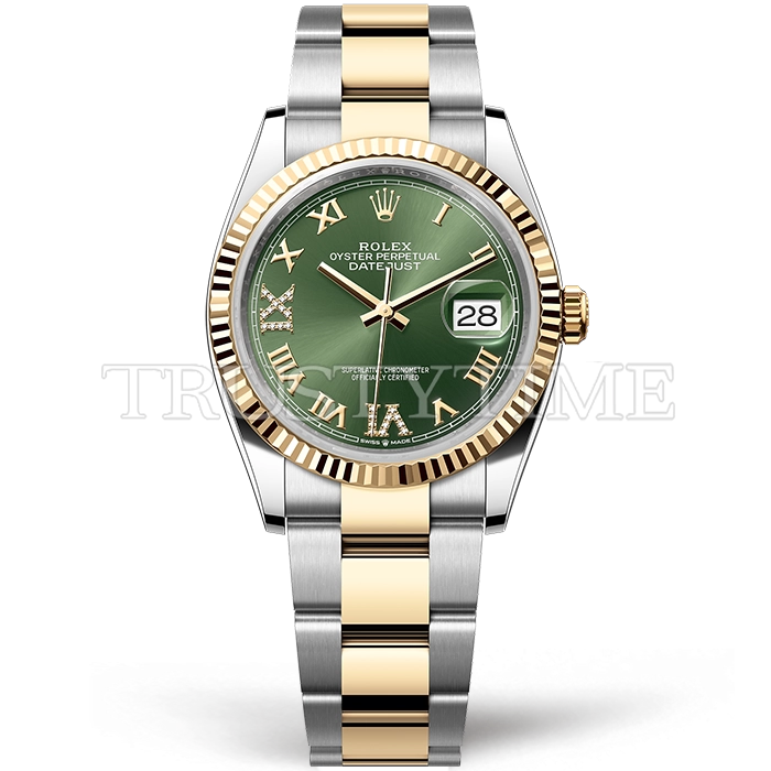 Часы Rolex из коллекции DateJust. Классические женские часы Rolex DateJust 36mm 126233-0026 премиального качества (Артикул магазина: RX-2542) оснащены надежным автоматическим механизмом с автоподзаводом (работает от амплитуды движения руки) калибра 3235, в котором реализованы следующие функции: часовая, минутная и секундная стрелки, а так же дата. Круглый корпус часов комбинированного сталь с желтого золота цвета, имеющий размер 36 мм и высоту 12 мм превосходно дополнит образ и украсит запястье своего обладателя. Для изготовления часов Rolex DateJust 36mm 126233-0026 предлагаемых в нашем интернет-магазине, применяются нержавеющая сталь 904L высокого качества (Швейцарский стандарт), а так же сапфировое стекло высокой прочности, благодаря чему обеспечивается максимальная защита от сколов и механических повреждений. Отличительной чертой данной модели является зеленый циферблат, часовые индексы которого обеспечивают римские цифры. Завершает образ браслет из нержавеющей стали комбинированного сталь с желтым золотом цвета с фирменной раскладывающейся застежкой Rolex. Водонепроницаемость данной модели составляет 30М (WR30) – допускается минимальное воздействие с водой.