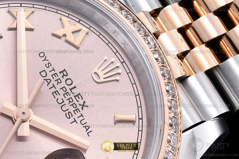 Часы Rolex из коллекции DateJust. Классические женские часы Rolex DateJust 36mm 126281RBR-0015 премиального качества (Артикул магазина: RX-2577) оснащены надежным автоматическим механизмом с автоподзаводом (работает от амплитуды движения руки) калибра 3235, в котором реализованы следующие функции: часовая, минутная и секундная стрелки, а так же дата. Круглый корпус часов комбинированного сталь с розового золота цвета, имеющий размер 36 мм и высоту 12 мм превосходно дополнит образ и украсит запястье своего обладателя. Для изготовления часов Rolex DateJust 36mm 126281RBR-0015 предлагаемых в нашем интернет-магазине, применяются нержавеющая сталь 904L высокого качества (Швейцарский стандарт), а так же сапфировое стекло высокой прочности, благодаря чему обеспечивается максимальная защита от сколов и механических повреждений. Отличительной чертой данной модели является золотой циферблат, часовые индексы которого обеспечивают римские цифры. Завершает образ браслет из нержавеющей стали комбинированного сталь с розовым золотом цвета с фирменной раскладывающейся застежкой Rolex. Водонепроницаемость данной модели составляет 30М (WR30) – допускается минимальное воздействие с водой.