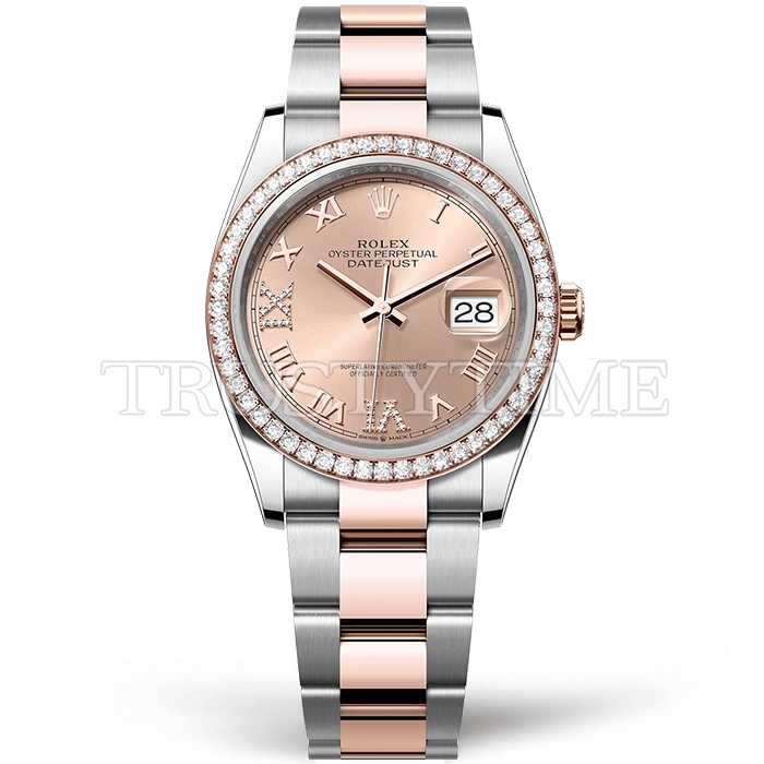 Часы Rolex из коллекции DateJust. Классические женские часы Rolex DateJust 36mm 126281RBR-0016 премиального качества (Артикул магазина: RX-2578) оснащены надежным автоматическим механизмом с автоподзаводом (работает от амплитуды движения руки) калибра 3235, в котором реализованы следующие функции: часовая, минутная и секундная стрелки, а так же дата. Круглый корпус часов комбинированного сталь с розового золота цвета, имеющий размер 36 мм и высоту 12 мм превосходно дополнит образ и украсит запястье своего обладателя. Для изготовления часов Rolex DateJust 36mm 126281RBR-0016 предлагаемых в нашем интернет-магазине, применяются нержавеющая сталь 904L высокого качества (Швейцарский стандарт), а так же сапфировое стекло высокой прочности, благодаря чему обеспечивается максимальная защита от сколов и механических повреждений. Отличительной чертой данной модели является золотой циферблат, часовые индексы которого обеспечивают римские цифры. Завершает образ браслет из нержавеющей стали комбинированного сталь с розовым золотом цвета с фирменной раскладывающейся застежкой Rolex. Водонепроницаемость данной модели составляет 30М (WR30) – допускается минимальное воздействие с водой.