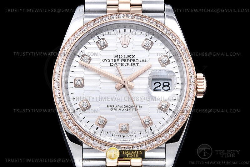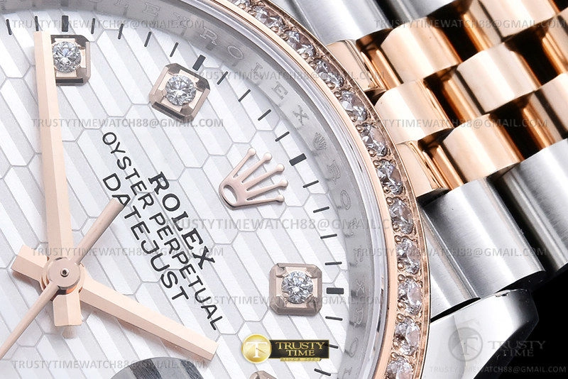 Часы Rolex из коллекции DateJust. Классические женские часы Rolex DateJust 36mm 126281RBR-0027 премиального качества (Артикул магазина: RX-2581) оснащены надежным автоматическим механизмом с автоподзаводом (работает от амплитуды движения руки) калибра 3235, в котором реализованы следующие функции: часовая, минутная и секундная стрелки, а так же дата. Круглый корпус часов комбинированного сталь с розового золота цвета, имеющий размер 36 мм и высоту 12 мм превосходно дополнит образ и украсит запястье своего обладателя. Для изготовления часов Rolex DateJust 36mm 126281RBR-0027 предлагаемых в нашем интернет-магазине, применяются нержавеющая сталь 316F высокого качества (Швейцарский стандарт), а так же сапфировое стекло высокой прочности, благодаря чему обеспечивается максимальная защита от сколов и механических повреждений. Отличительной чертой данной модели является серебристый циферблат, часовые индексы которого обеспечивают камни. Завершает образ браслет из нержавеющей стали комбинированного сталь с розовым золотом цвета с фирменной раскладывающейся застежкой Rolex. Водонепроницаемость данной модели составляет 30М (WR30) – допускается минимальное воздействие с водой.