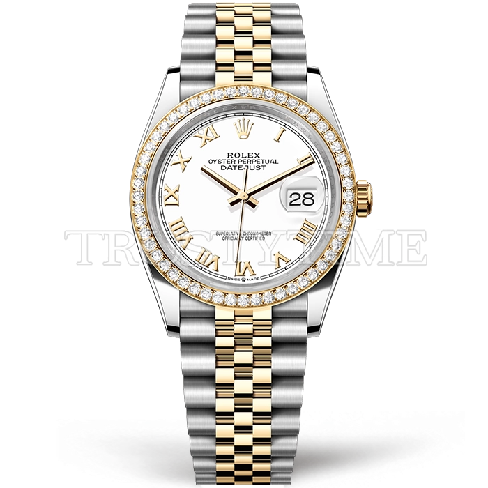 Часы Rolex из коллекции DateJust. Классические женские часы Rolex DateJust 36mm 126283RBR-0015 премиального качества (Артикул магазина: RX-2597) оснащены надежным автоматическим механизмом с автоподзаводом (работает от амплитуды движения руки) калибра 3135, в котором реализованы следующие функции: часовая, минутная и секундная стрелки, а так же дата. Круглый корпус часов комбинированного сталь с желтого золота цвета, имеющий размер 36 мм и высоту 12 мм превосходно дополнит образ и украсит запястье своего обладателя. Для изготовления часов Rolex DateJust 36mm 126283RBR-0015 предлагаемых в нашем интернет-магазине, применяются нержавеющая сталь 316F высокого качества (Швейцарский стандарт), а так же сапфировое стекло высокой прочности, благодаря чему обеспечивается максимальная защита от сколов и механических повреждений. Отличительной чертой данной модели является белый циферблат, часовые индексы которого обеспечивают римские цифры. Завершает образ браслет из нержавеющей стали комбинированного сталь с желтым золотом цвета с фирменной раскладывающейся застежкой Rolex. Водонепроницаемость данной модели составляет 30М (WR30) – допускается минимальное воздействие с водой.