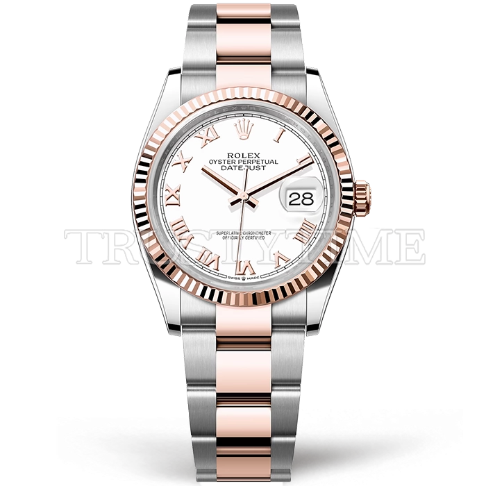 Часы Rolex из коллекции DateJust. Классические женские часы Rolex DateJust 36mm 126231-0016 премиального качества (Артикул магазина: RX-2986) оснащены надежным автоматическим механизмом с автоподзаводом (работает от амплитуды движения руки) калибра 3135, в котором реализованы следующие функции: часовая, минутная и секундная стрелки, а так же дата. Круглый корпус часов комбинированного сталь с розового золота цвета, имеющий размер 36 мм и высоту 12 мм превосходно дополнит образ и украсит запястье своего обладателя. Для изготовления часов Rolex DateJust 36mm 126231-0016 предлагаемых в нашем интернет-магазине, применяются нержавеющая сталь 316F высокого качества (Швейцарский стандарт), а так же сапфировое стекло высокой прочности, благодаря чему обеспечивается максимальная защита от сколов и механических повреждений. Отличительной чертой данной модели является белый циферблат, часовые индексы которого обеспечивают римские цифры. Завершает образ браслет из нержавеющей стали комбинированного сталь с розовым золотом цвета с фирменной раскладывающейся застежкой Rolex. Водонепроницаемость данной модели составляет 30М (WR30) – допускается минимальное воздействие с водой.