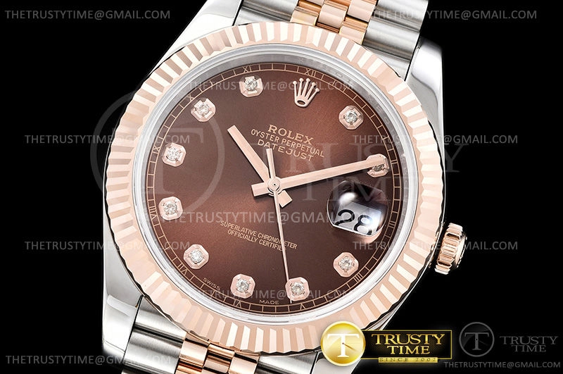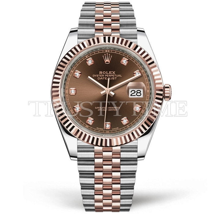 Часы Rolex из коллекции DateJust II. Классические мужские часы Rolex DateJust II 41mm 126331-0004 премиального качества (Артикул магазина: RX-0835) оснащены надежным автоматическим механизмом с автоподзаводом (работает от амплитуды движения руки) калибра 3235, в котором реализованы следующие функции: часовая, минутная и секундная стрелки, а так же дата. Круглый корпус часов комбинированного сталь с розового золота цвета, имеющий размер 41 мм и высоту 13 мм превосходно дополнит образ и украсит запястье своего обладателя. Для изготовления часов Rolex DateJust II 41mm 126331-0004 предлагаемых в нашем интернет-магазине, применяются нержавеющая сталь 316F высокого качества (Швейцарский стандарт), а так же сапфировое стекло высокой прочности, благодаря чему обеспечивается максимальная защита от сколов и механических повреждений. Отличительной чертой данной модели является коричневый циферблат, часовые индексы которого обеспечивают камни. Завершает образ браслет из нержавеющей стали комбинированного сталь с розовым золотом цвета с фирменной раскладывающейся застежкой Rolex. Водонепроницаемость данной модели составляет 30М (WR30) – допускается минимальное воздействие с водой.