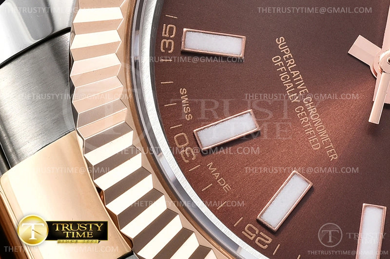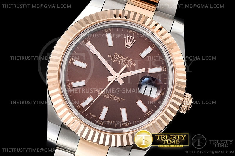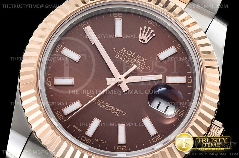Часы Rolex из коллекции DateJust II. Классические мужские часы Rolex DateJust II 41mm 126331-0001 премиального качества (Артикул магазина: RX-0810) оснащены надежным автоматическим механизмом с автоподзаводом (работает от амплитуды движения руки) калибра 3235, в котором реализованы следующие функции: часовая, минутная и секундная стрелки, а так же дата. Круглый корпус часов комбинированного сталь с розового золота цвета, имеющий размер 41 мм и высоту 12 мм превосходно дополнит образ и украсит запястье своего обладателя. Для изготовления часов Rolex DateJust II 41mm 126331-0001 предлагаемых в нашем интернет-магазине, применяются нержавеющая сталь 316F высокого качества (Швейцарский стандарт), а так же сапфировое стекло высокой прочности, благодаря чему обеспечивается максимальная защита от сколов и механических повреждений. Отличительной чертой данной модели является коричневый циферблат, часовые индексы которого обеспечивают часовые метки. Завершает образ браслет из нержавеющей стали комбинированного сталь с розовым золотом цвета с фирменной раскладывающейся застежкой Rolex. Водонепроницаемость данной модели составляет 30М (WR30) – допускается минимальное воздействие с водой.