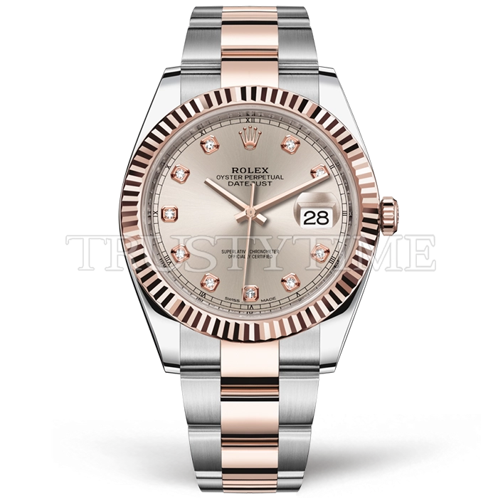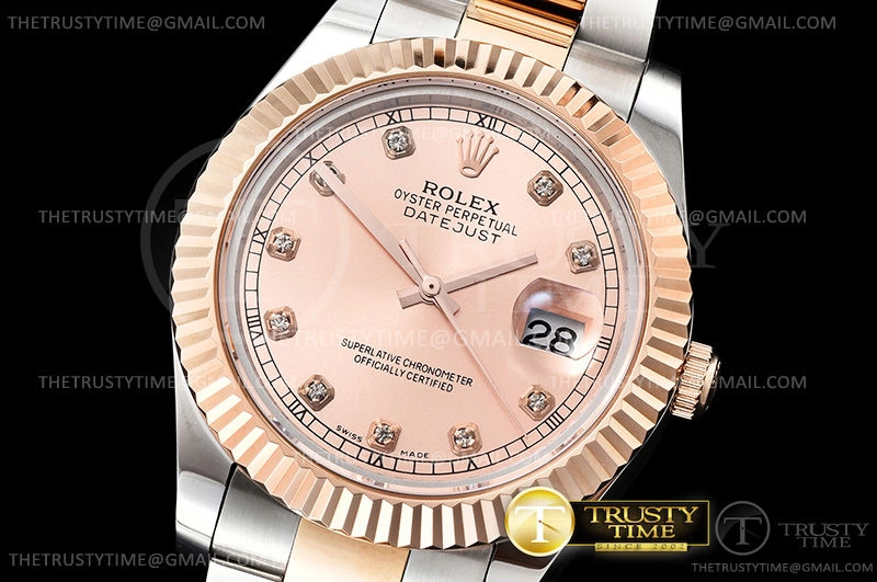 Часы Rolex из коллекции DateJust II. Классические мужские часы Rolex DateJust II 41mm 126331-0007 премиального качества (Артикул магазина: RX-0812) оснащены надежным автоматическим механизмом с автоподзаводом (работает от амплитуды движения руки) калибра 3235, в котором реализованы следующие функции: часовая, минутная и секундная стрелки, а так же дата. Круглый корпус часов комбинированного сталь с розового золота цвета, имеющий размер 41 мм и высоту 12 мм превосходно дополнит образ и украсит запястье своего обладателя. Для изготовления часов Rolex DateJust II 41mm 126331-0007 предлагаемых в нашем интернет-магазине, применяются нержавеющая сталь 316F высокого качества (Швейцарский стандарт), а так же сапфировое стекло высокой прочности, благодаря чему обеспечивается максимальная защита от сколов и механических повреждений. Отличительной чертой данной модели является золотой циферблат, часовые индексы которого обеспечивают камни. Завершает образ браслет из нержавеющей стали комбинированного сталь с розовым золотом цвета с фирменной раскладывающейся застежкой Rolex. Водонепроницаемость данной модели составляет 30М (WR30) – допускается минимальное воздействие с водой.