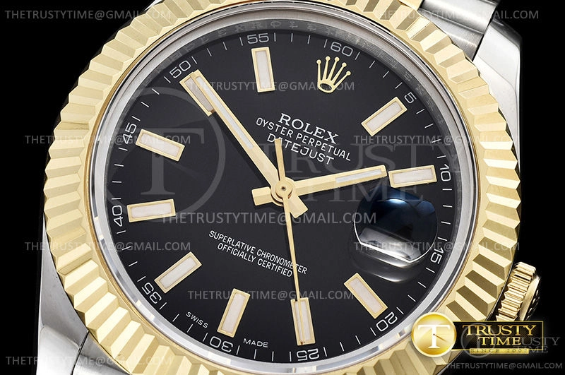 Часы Rolex из коллекции DateJust II. Классические мужские часы Rolex DateJust II 41mm 126333-0014 премиального качества (Артикул магазина: RX-0774) оснащены надежным автоматическим механизмом с автоподзаводом (работает от амплитуды движения руки) калибра 3235, в котором реализованы следующие функции: часовая, минутная и секундная стрелки, а так же дата. Круглый корпус часов комбинированного сталь с желтого золота цвета, имеющий размер 41 мм и высоту 12 мм превосходно дополнит образ и украсит запястье своего обладателя. Для изготовления часов Rolex DateJust II 41mm 126333-0014 предлагаемых в нашем интернет-магазине, применяются нержавеющая сталь 316F высокого качества (Швейцарский стандарт), а так же сапфировое стекло высокой прочности, благодаря чему обеспечивается максимальная защита от сколов и механических повреждений. Отличительной чертой данной модели является черный циферблат, часовые индексы которого обеспечивают часовые метки. Завершает образ браслет из нержавеющей стали комбинированного сталь с желтым золотом цвета с фирменной раскладывающейся застежкой Rolex. Водонепроницаемость данной модели составляет 30М (WR30) – допускается минимальное воздействие с водой.