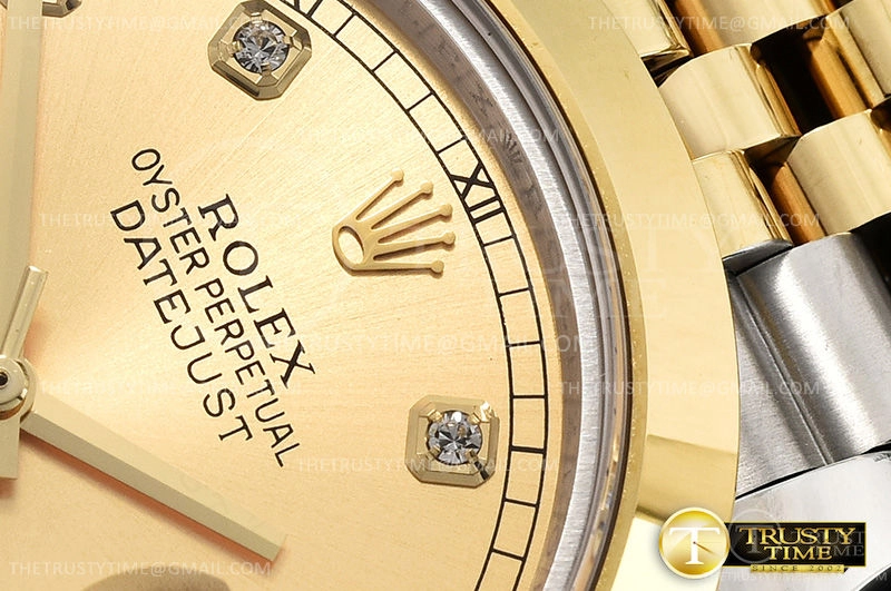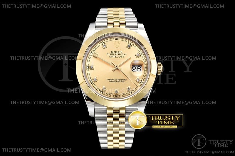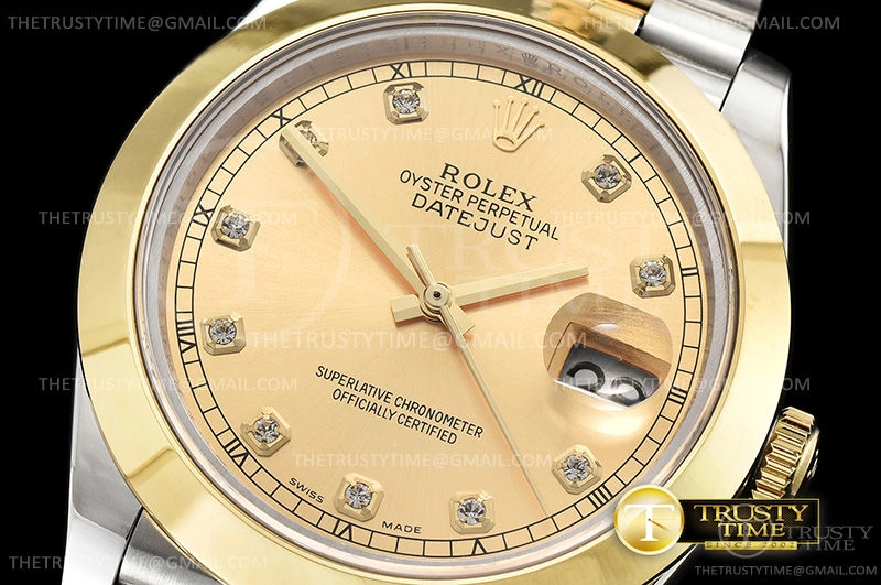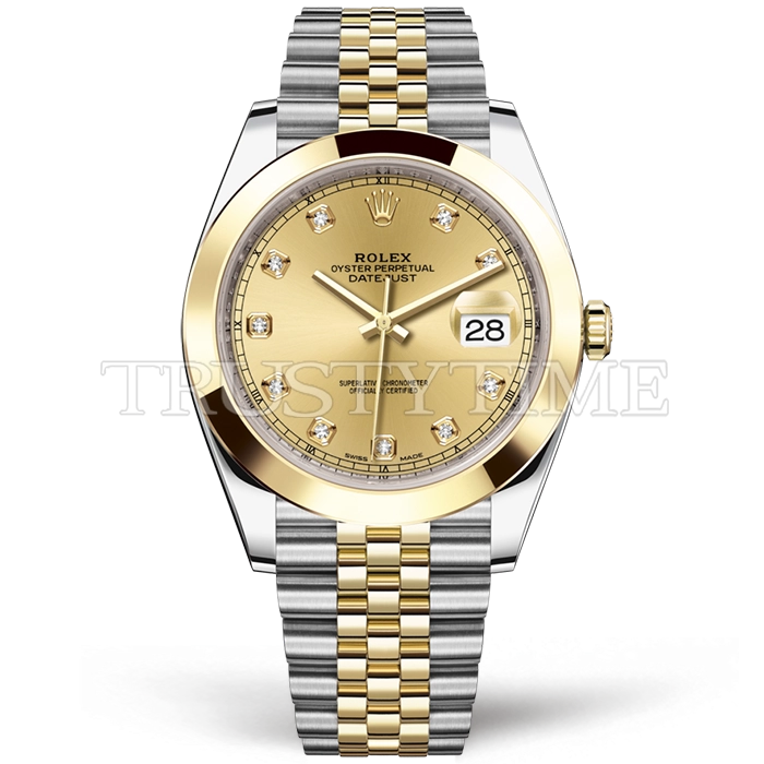 Часы Rolex из коллекции DateJust II. Классические мужские часы Rolex DateJust II 41mm 126303-0012 премиального качества (Артикул магазина: RX-0748) оснащены надежным автоматическим механизмом с автоподзаводом (работает от амплитуды движения руки) калибра 3235, в котором реализованы следующие функции: часовая, минутная и секундная стрелки, а так же дата. Круглый корпус часов комбинированного сталь с желтого золота цвета, имеющий размер 41 мм и высоту 12 мм превосходно дополнит образ и украсит запястье своего обладателя. Для изготовления часов Rolex DateJust II 41mm 126303-0012 предлагаемых в нашем интернет-магазине, применяются нержавеющая сталь 316F высокого качества (Швейцарский стандарт), а так же сапфировое стекло высокой прочности, благодаря чему обеспечивается максимальная защита от сколов и механических повреждений. Отличительной чертой данной модели является золотой циферблат, часовые индексы которого обеспечивают камни. Завершает образ браслет из нержавеющей стали комбинированного сталь с желтым золотом цвета с фирменной раскладывающейся застежкой Rolex. Водонепроницаемость данной модели составляет 30М (WR30) – допускается минимальное воздействие с водой.
