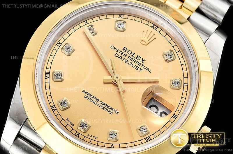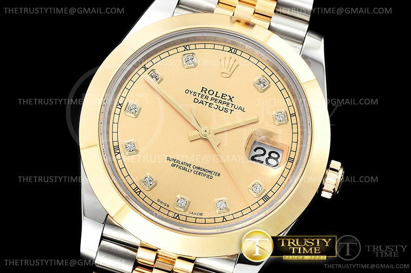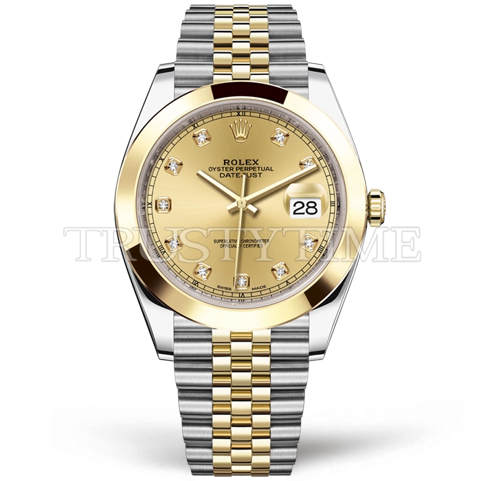 Часы Rolex из коллекции DateJust II. Классические мужские часы Rolex DateJust II 41mm 126303-0012 премиального качества (Артикул магазина: RX-0715) оснащены надежным автоматическим механизмом с автоподзаводом (работает от амплитуды движения руки) калибра 3235, в котором реализованы следующие функции: часовая, минутная и секундная стрелки, а так же дата. Круглый корпус часов комбинированного сталь с желтого золота цвета, имеющий размер 41 мм и высоту 12 мм превосходно дополнит образ и украсит запястье своего обладателя. Для изготовления часов Rolex DateJust II 41mm 126303-0012 предлагаемых в нашем интернет-магазине, применяются нержавеющая сталь 316F высокого качества (Швейцарский стандарт), а так же сапфировое стекло высокой прочности, благодаря чему обеспечивается максимальная защита от сколов и механических повреждений. Отличительной чертой данной модели является золотой циферблат, часовые индексы которого обеспечивают камни. Завершает образ браслет из нержавеющей стали комбинированного сталь с желтым золотом цвета с фирменной раскладывающейся застежкой Rolex. Водонепроницаемость данной модели составляет 30М (WR30) – допускается минимальное воздействие с водой.