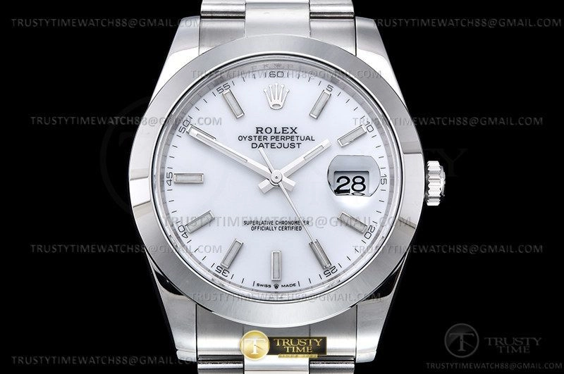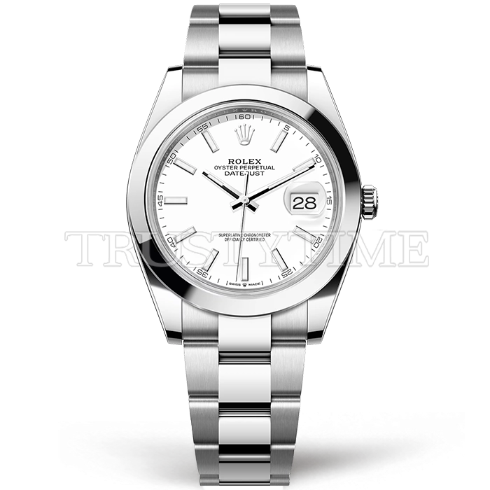 Часы Rolex из коллекции DateJust II. Классические мужские часы Rolex DateJust II 41mm 126300-0005 премиального качества (Артикул магазина: RX-2318) оснащены надежным автоматическим механизмом с автоподзаводом (работает от амплитуды движения руки) калибра 3235, в котором реализованы следующие функции: часовая, минутная и секундная стрелки, а так же дата. Круглый корпус часов стального цвета, имеющий размер 41 мм и высоту 12 мм превосходно дополнит образ и украсит запястье своего обладателя. Для изготовления часов Rolex DateJust II 41mm 126300-0005 предлагаемых в нашем интернет-магазине, применяются нержавеющая сталь 904L высокого качества (Швейцарский стандарт), а так же сапфировое стекло высокой прочности, благодаря чему обеспечивается максимальная защита от сколов и механических повреждений. Отличительной чертой данной модели является белый циферблат, часовые индексы которого обеспечивают часовые метки. Завершает образ браслет из нержавеющей стали стального цвета с фирменной раскладывающейся застежкой Rolex. Водонепроницаемость данной модели составляет 30М (WR30) – допускается минимальное воздействие с водой.