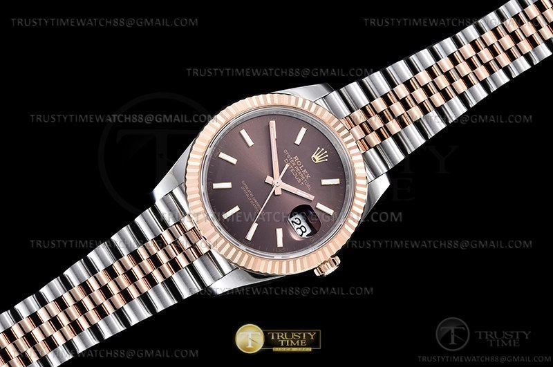 Часы Rolex из коллекции DateJust II. Классические мужские часы Rolex DateJust II 41mm 126331-0002 премиального качества (Артикул магазина: RX-2326) оснащены надежным автоматическим механизмом с автоподзаводом (работает от амплитуды движения руки) калибра 3235, в котором реализованы следующие функции: часовая, минутная и секундная стрелки, а так же дата. Круглый корпус часов комбинированного сталь с розового золота цвета, имеющий размер 41 мм и высоту 12 мм превосходно дополнит образ и украсит запястье своего обладателя. Для изготовления часов Rolex DateJust II 41mm 126331-0002 предлагаемых в нашем интернет-магазине, применяются нержавеющая сталь 904L высокого качества (Швейцарский стандарт), а так же сапфировое стекло высокой прочности, благодаря чему обеспечивается максимальная защита от сколов и механических повреждений. Отличительной чертой данной модели является коричневый циферблат, часовые индексы которого обеспечивают часовые метки. Завершает образ браслет из нержавеющей стали комбинированного сталь с розовым золотом цвета с фирменной раскладывающейся застежкой Rolex. Водонепроницаемость данной модели составляет 30М (WR30) – допускается минимальное воздействие с водой.