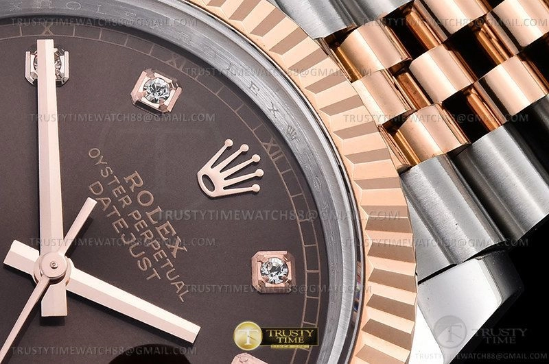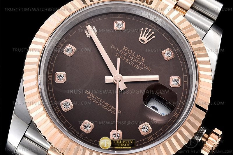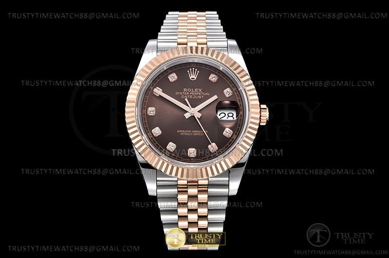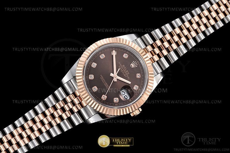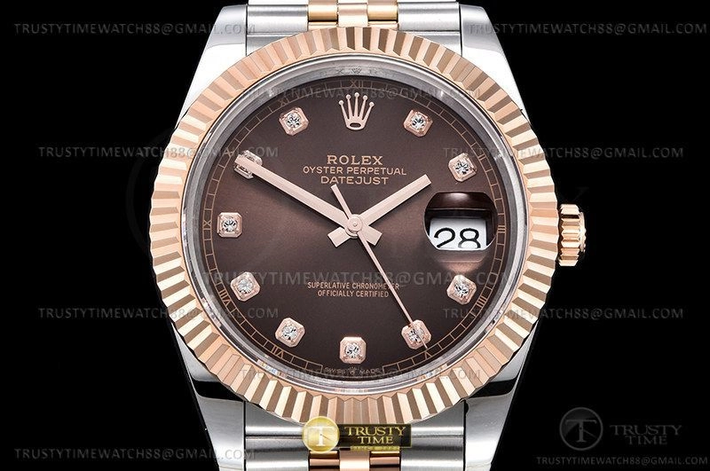 Часы Rolex из коллекции DateJust II. Классические мужские часы Rolex DateJust II 41mm 126331-0004 премиального качества (Артикул магазина: RX-2676) оснащены надежным автоматическим механизмом с автоподзаводом (работает от амплитуды движения руки) калибра 3235, в котором реализованы следующие функции: часовая, минутная и секундная стрелки, а так же дата. Круглый корпус часов комбинированного сталь с розового золота цвета, имеющий размер 41 мм и высоту 13 мм превосходно дополнит образ и украсит запястье своего обладателя. Для изготовления часов Rolex DateJust II 41mm 126331-0004 предлагаемых в нашем интернет-магазине, применяются нержавеющая сталь 316F высокого качества (Швейцарский стандарт), а так же сапфировое стекло высокой прочности, благодаря чему обеспечивается максимальная защита от сколов и механических повреждений. Отличительной чертой данной модели является коричневый циферблат, часовые индексы которого обеспечивают камни. Завершает образ браслет из нержавеющей стали комбинированного сталь с розовым золотом цвета с фирменной раскладывающейся застежкой Rolex. Водонепроницаемость данной модели составляет 30М (WR30) – допускается минимальное воздействие с водой.