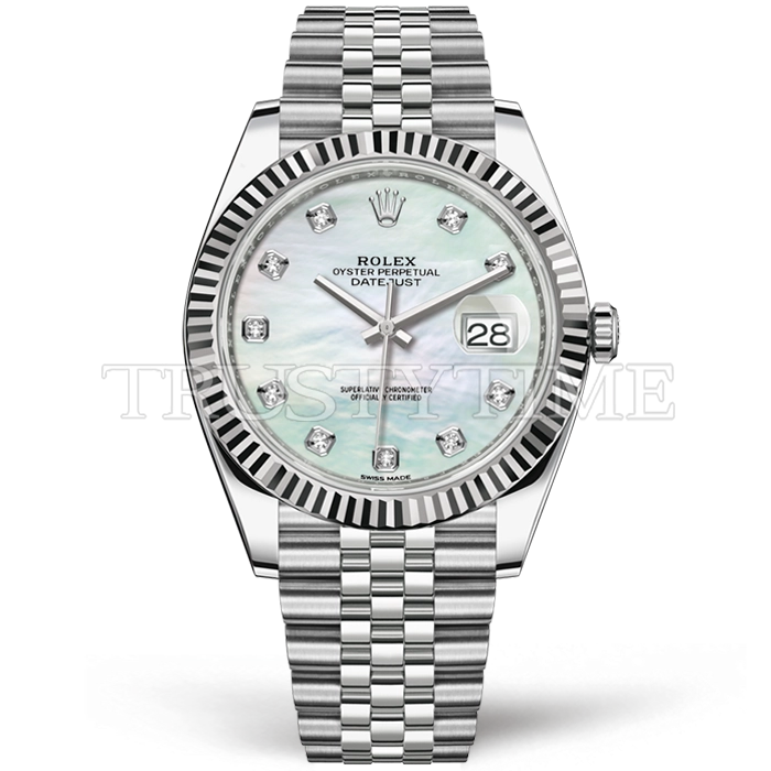 Часы Rolex из коллекции DateJust II. Классические мужские часы Rolex DateJust II 41mm 126334-0020 премиального качества (Артикул магазина: RX-2690) оснащены надежным автоматическим механизмом с автоподзаводом (работает от амплитуды движения руки) калибра 3235, в котором реализованы следующие функции: часовая, минутная и секундная стрелки, а так же дата. Круглый корпус часов стального цвета, имеющий размер 41 мм и высоту 11.7 мм превосходно дополнит образ и украсит запястье своего обладателя. Для изготовления часов Rolex DateJust II 41mm 126334-0020 предлагаемых в нашем интернет-магазине, применяются нержавеющая сталь 904L высокого качества (Швейцарский стандарт), а так же сапфировое стекло высокой прочности, благодаря чему обеспечивается максимальная защита от сколов и механических повреждений. Отличительной чертой данной модели является перламутровый циферблат, часовые индексы которого обеспечивают камни. Завершает образ браслет из нержавеющей стали стального цвета с фирменной раскладывающейся застежкой Rolex. Водонепроницаемость данной модели составляет 30М (WR30) – допускается минимальное воздействие с водой.