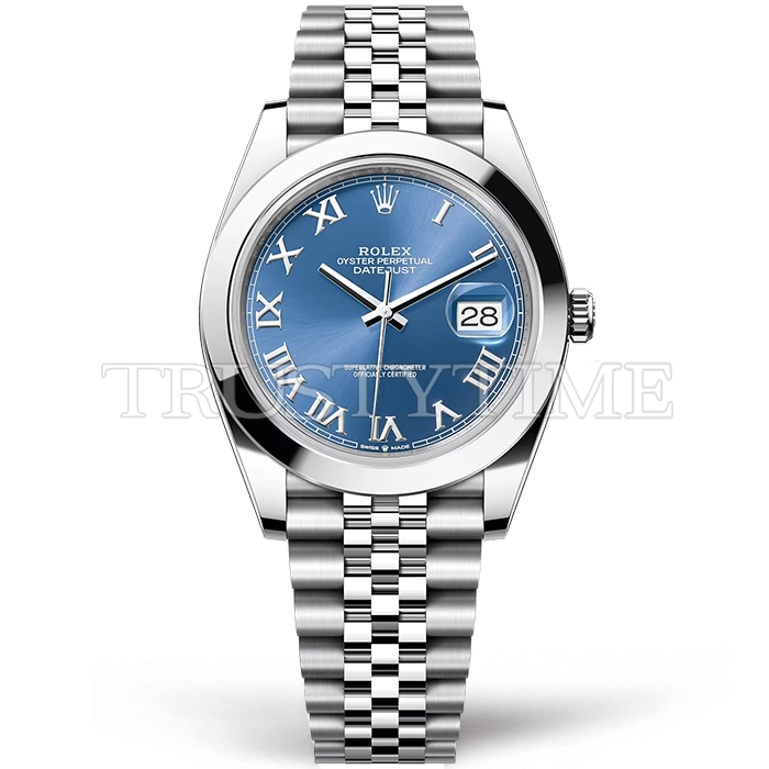 Часы Rolex из коллекции DateJust II. Классические мужские часы Rolex DateJust II 41mm 126300-0018 премиального качества (Артикул магазина: RX-2644) оснащены надежным автоматическим механизмом с автоподзаводом (работает от амплитуды движения руки) калибра 3235, в котором реализованы следующие функции: часовая, минутная и секундная стрелки, а так же дата. Круглый корпус часов стального цвета, имеющий размер 41 мм и высоту 12 мм превосходно дополнит образ и украсит запястье своего обладателя. Для изготовления часов Rolex DateJust II 41mm 126300-0018 предлагаемых в нашем интернет-магазине, применяются нержавеющая сталь 316F высокого качества (Швейцарский стандарт), а так же сапфировое стекло высокой прочности, благодаря чему обеспечивается максимальная защита от сколов и механических повреждений. Отличительной чертой данной модели является синий циферблат, часовые индексы которого обеспечивают римские цифры. Завершает образ браслет из нержавеющей стали стального цвета с фирменной раскладывающейся застежкой Rolex. Водонепроницаемость данной модели составляет 30М (WR30) – допускается минимальное воздействие с водой.
