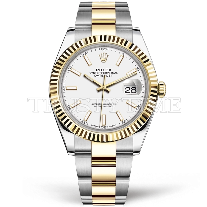 Часы Rolex из коллекции DateJust II. Классические мужские часы Rolex DateJust II 41mm 126333-0015 премиального качества (Артикул магазина: RX-2934) оснащены надежным автоматическим механизмом с автоподзаводом (работает от амплитуды движения руки) калибра 3235, в котором реализованы следующие функции: часовая, минутная и секундная стрелки, а так же дата. Круглый корпус часов комбинированного сталь с желтого золота цвета, имеющий размер 41 мм и высоту 12 мм превосходно дополнит образ и украсит запястье своего обладателя. Для изготовления часов Rolex DateJust II 41mm 126333-0015 предлагаемых в нашем интернет-магазине, применяются нержавеющая сталь 904L высокого качества (Швейцарский стандарт), а так же сапфировое стекло высокой прочности, благодаря чему обеспечивается максимальная защита от сколов и механических повреждений. Отличительной чертой данной модели является белый циферблат, часовые индексы которого обеспечивают часовые метки. Завершает образ браслет из нержавеющей стали комбинированного сталь с желтым золотом цвета с фирменной раскладывающейся застежкой Rolex. Водонепроницаемость данной модели составляет 30М (WR30) – допускается минимальное воздействие с водой.