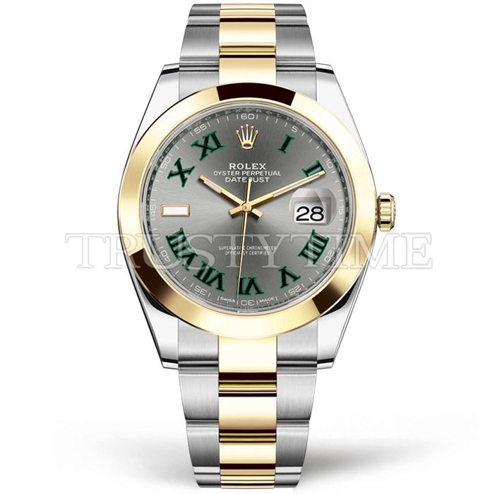 Часы Rolex из коллекции DateJust II. Классические мужские часы Rolex DateJust II 41mm 126303-0019 премиального качества (Артикул магазина: RX-2944) оснащены надежным автоматическим механизмом с автоподзаводом (работает от амплитуды движения руки) калибра 3235, в котором реализованы следующие функции: часовая, минутная и секундная стрелки, а так же дата. Круглый корпус часов комбинированного сталь с желтого золота цвета, имеющий размер 41 мм и высоту 12 мм превосходно дополнит образ и украсит запястье своего обладателя. Для изготовления часов Rolex DateJust II 41mm 126303-0019 предлагаемых в нашем интернет-магазине, применяются нержавеющая сталь 316F высокого качества (Швейцарский стандарт), а так же сапфировое стекло высокой прочности, благодаря чему обеспечивается максимальная защита от сколов и механических повреждений. Отличительной чертой данной модели является серый циферблат, часовые индексы которого обеспечивают римские цифры. Завершает образ браслет из нержавеющей стали комбинированного сталь с желтым золотом цвета с фирменной раскладывающейся застежкой Rolex. Водонепроницаемость данной модели составляет 30М (WR30) – допускается минимальное воздействие с водой.