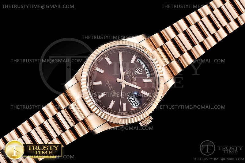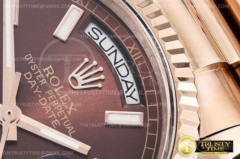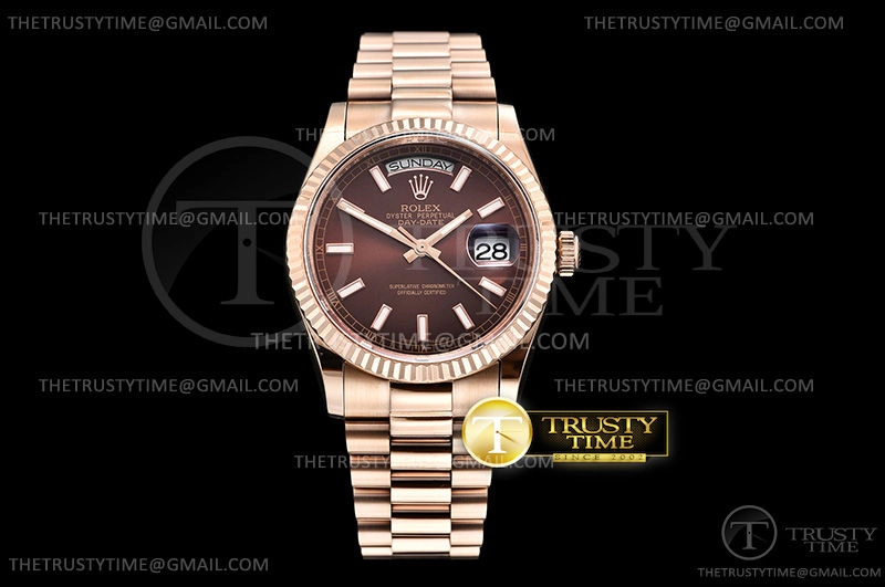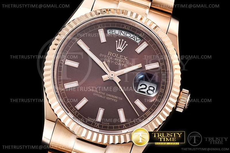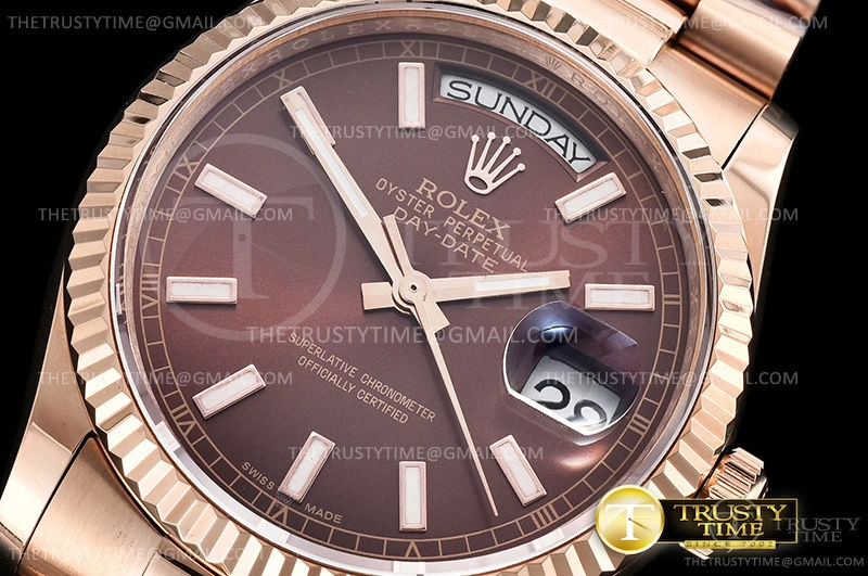 Часы Rolex из коллекции Day-Date. Классические женские часы Rolex Day-Date 36mm 118235F-0121 премиального качества (Артикул магазина: RX-0963) оснащены надежным автоматическим механизмом с автоподзаводом (работает от амплитуды движения руки) калибра 3255, в котором реализованы следующие функции: часовая, минутная и секундная стрелки, а так же дата, день недели. Круглый корпус часов розового цвета, имеющий размер 36 мм и высоту 12 мм превосходно дополнит образ и украсит запястье своего обладателя. Для изготовления часов Rolex Day-Date 36mm 118235F-0121 предлагаемых в нашем интернет-магазине, применяются нержавеющая сталь 904 высокого качества (Швейцарский стандарт), а так же сапфировое стекло высокой прочности, благодаря чему обеспечивается максимальная защита от сколов и механических повреждений. Отличительной чертой данной модели является коричневый циферблат, часовые индексы которого обеспечивают часовые метки. Завершает образ браслет из нержавеющей стали цвета розового золота с фирменной раскладывающейся застежкой Rolex. Водонепроницаемость данной модели составляет 30М (WR30) – допускается минимальное воздействие с водой.