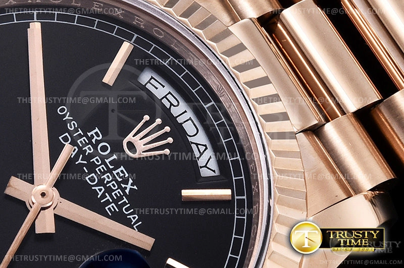 Часы Rolex из коллекции Day-Date. Классические женские часы Rolex Day-Date 36mm 118235F-0004 премиального качества (Артикул магазина: RX-0932) оснащены надежным автоматическим механизмом с автоподзаводом (работает от амплитуды движения руки) калибра 3255, в котором реализованы следующие функции: часовая, минутная и секундная стрелки, а так же дата, день недели. Круглый корпус часов розового цвета, имеющий размер 36 мм и высоту 12 мм превосходно дополнит образ и украсит запястье своего обладателя. Для изготовления часов Rolex Day-Date 36mm 118235F-0004 предлагаемых в нашем интернет-магазине, применяются нержавеющая сталь 904 высокого качества (Швейцарский стандарт), а так же сапфировое стекло высокой прочности, благодаря чему обеспечивается максимальная защита от сколов и механических повреждений. Отличительной чертой данной модели является черный циферблат, часовые индексы которого обеспечивают часовые метки. Завершает образ браслет из нержавеющей стали цвета розового золота с фирменной раскладывающейся застежкой Rolex. Водонепроницаемость данной модели составляет 30М (WR30) – допускается минимальное воздействие с водой.