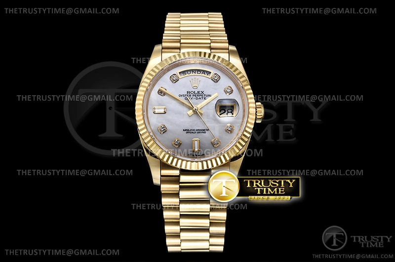 Часы Rolex из коллекции Day-Date. Классические женские часы Rolex Day-Date 36mm 128238-0011 премиального качества (Артикул магазина: RX-0899) оснащены надежным автоматическим механизмом с автоподзаводом (работает от амплитуды движения руки) калибра 3255, в котором реализованы следующие функции: часовая, минутная и секундная стрелки, а так же дата, день недели. Круглый корпус часов цветы желтой золота, имеющий размер 36 мм и высоту 12 мм превосходно дополнит образ и украсит запястье своего обладателя. Для изготовления часов Rolex Day-Date 36mm 128238-0011 предлагаемых в нашем интернет-магазине, применяются нержавеющая сталь 904 высокого качества (Швейцарский стандарт), а так же сапфировое стекло высокой прочности, благодаря чему обеспечивается максимальная защита от сколов и механических повреждений. Отличительной чертой данной модели является перламутровый циферблат, часовые индексы которого обеспечивают камни. Завершает образ браслет из нержавеющей стали цвета желтого золота с фирменной раскладывающейся застежкой Rolex. Водонепроницаемость данной модели составляет 30М (WR30) – допускается минимальное воздействие с водой.